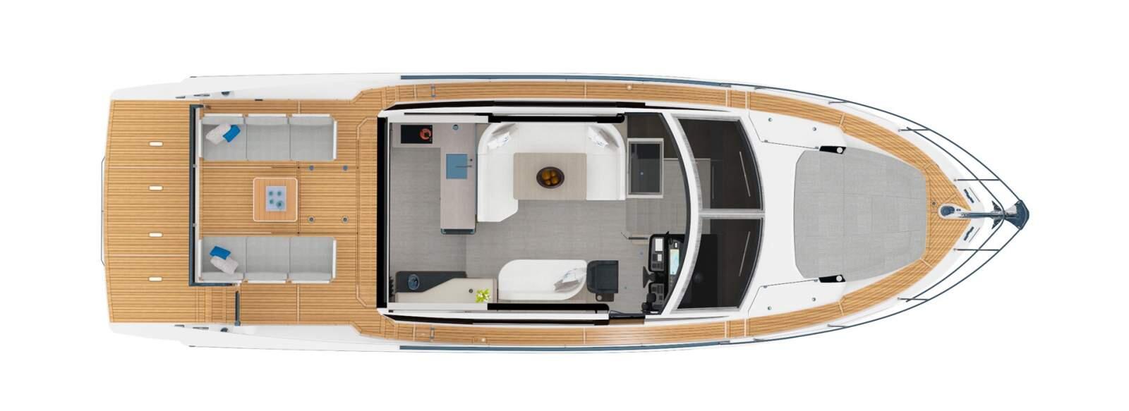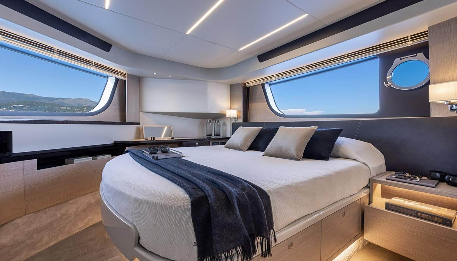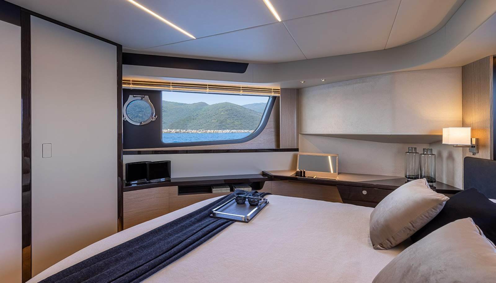 In the salon, the large side windows envelop the entire deck and, together with the panoramic windshield, offer uninterrupted visibility. From the inside, the breath-taking view turns into an actual 360-degree panorama. Moreover, the windows can be electrically opened, letting in the sea breeze and creating a pleasant, natural air recirculation.