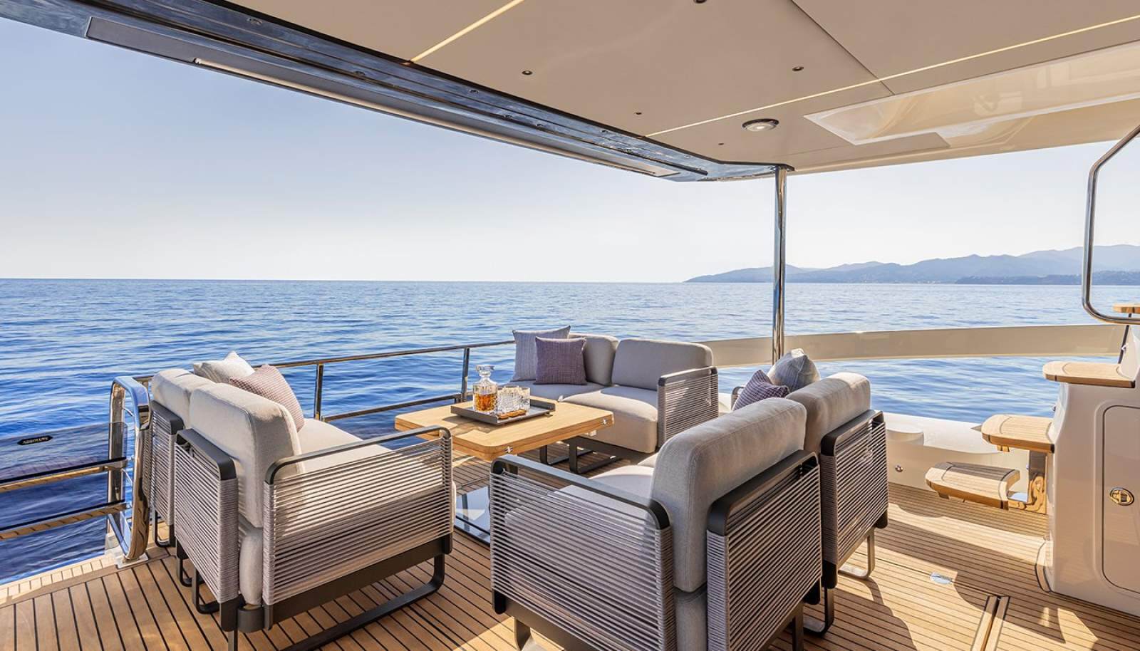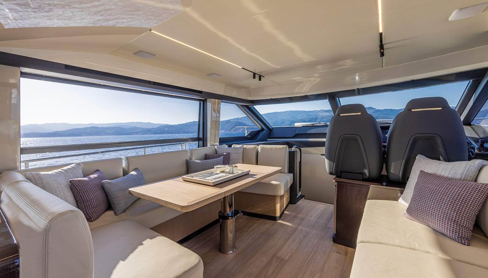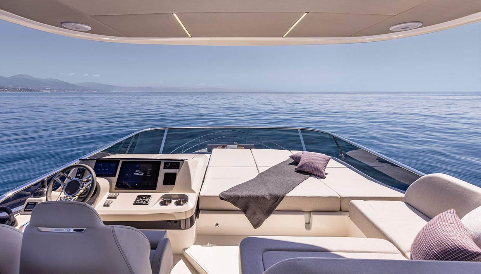 Natural light and beautiful views are a highlight to enjoy in every area of the boat: the boundaries between the boat and the sea are blurred by transparent panels in the cockpit area, as well as by the open railing, offering excellent visibility from the main deck. The visual experience becomes even more immersive thanks to large electric windows, to enjoy the view even when you are comfortably seated in the saloon, while also bringing some fresh air in.