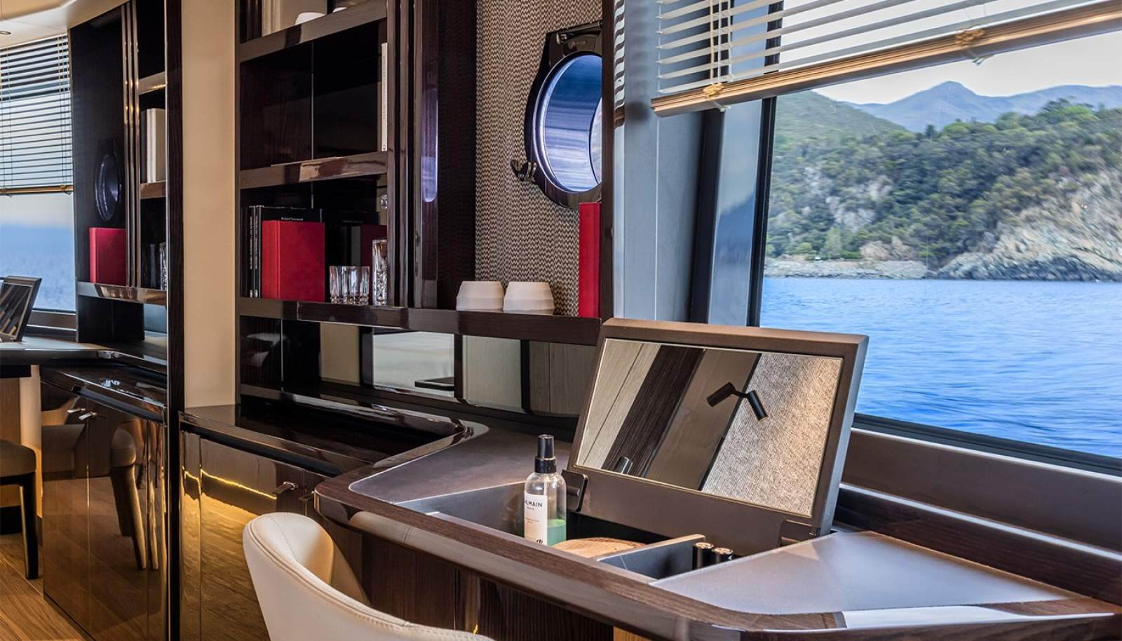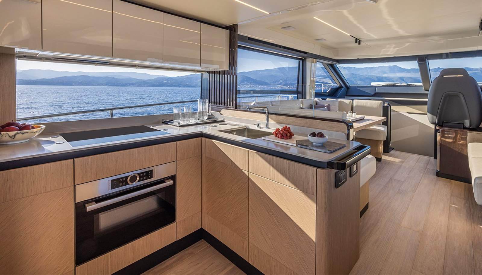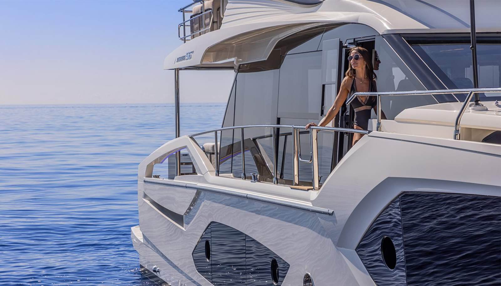 Natural light and beautiful views are a highlight to enjoy in every area of the boat: the boundaries between the boat and the sea are blurred by transparent panels in the cockpit area, as well as by the open railing, offering excellent visibility from the main deck. The visual experience becomes even more immersive thanks to large electric windows, to enjoy the view even when you are comfortably seated in the saloon, while also bringing some fresh air in.