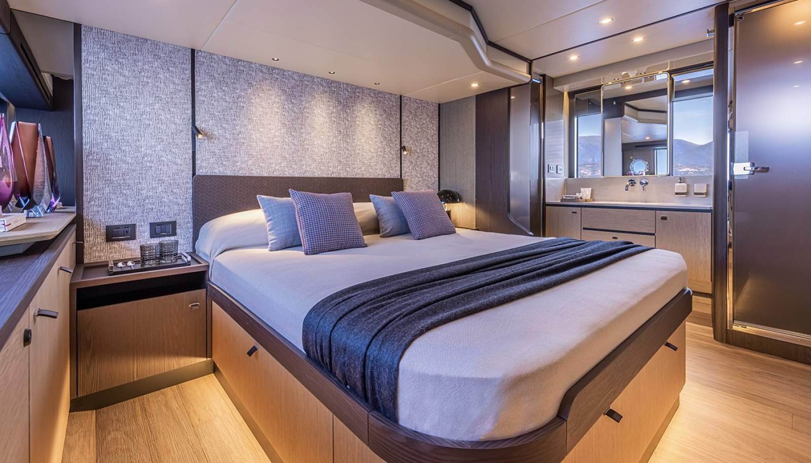 The sleeping area will provide plenty of room to sleep in comfort. The full-beam owner's cabin in the bow is designed to ensure privacy and convenience, as well as outstanding views through large windows. Its modern interiors are embellished with sophisticated features, transparent details between the cabin and bathroom, and textural contrasts. As spacious as a second owner's cabin, the VIP cabin is also full beam. A comfortable third cabin with single beds and a double crew cabin complete the sleeping area. With no inner steps, all lower deck cabins make the most of heights and volumes, with surprisingly large windows for unrivalled morning views, with plenty of natural light flooding in.