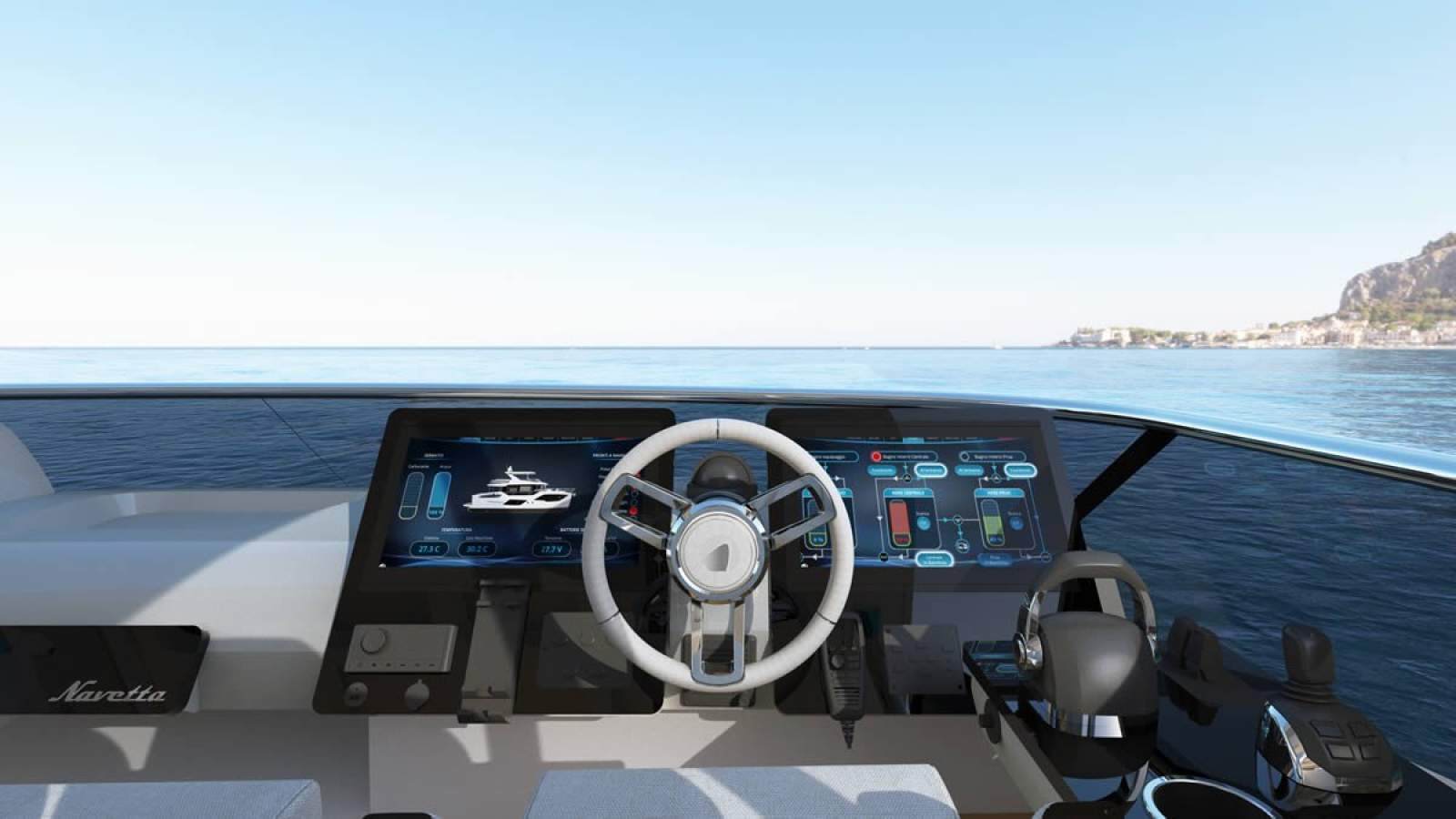 The exterior spaces of the Navetta 62 perfectly blend elegance and functionality, designed to offer a unique onboard experience. The open cockpit, with its modern design, harmoniously merges with the horizon, creating a seamless connection with the sea. Large glass surfaces and the angled glass towards the cockpit not only enhance natural lighting but also amplify the sense of spaciousness, immersing guests in a bright and airy environment.