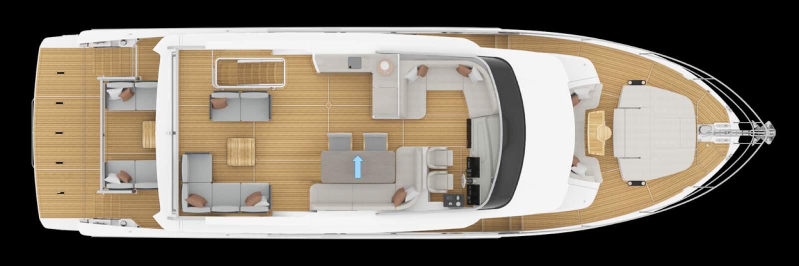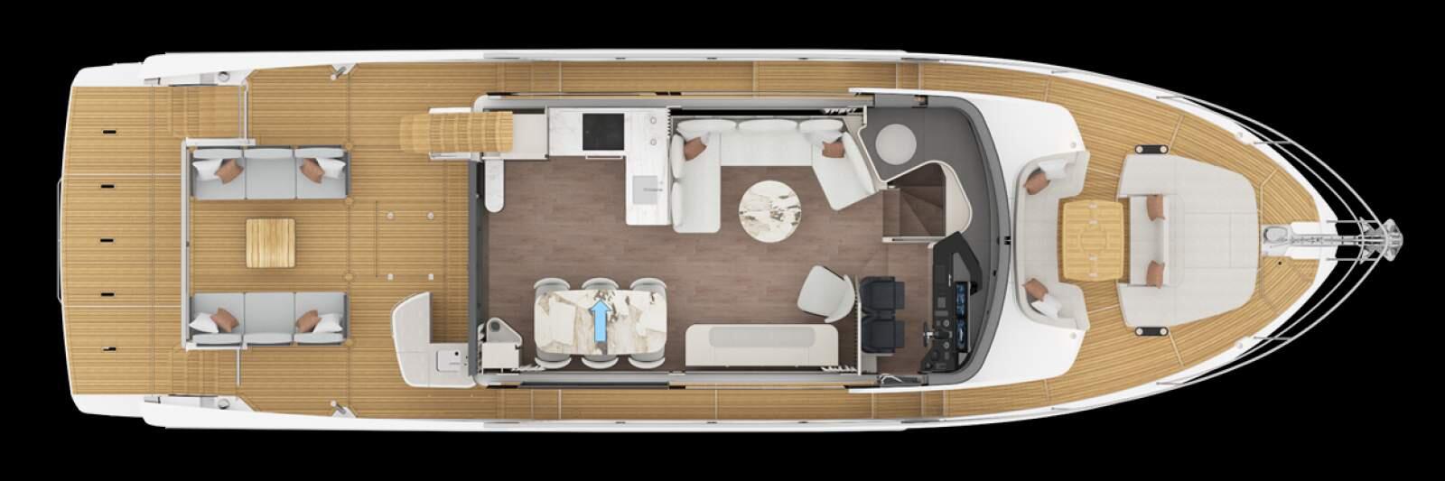 The flybridge, one of the highlights of the Navetta 62, is a true open-air panoramic lounge, offering guests an unparalleled view of the sea. With comfortable seating, a large sunbathing area, and a fully equipped bar, the flybridge provides the perfect setting for unforgettable moments of relaxation and entertainment, all in total comfort and freedom.