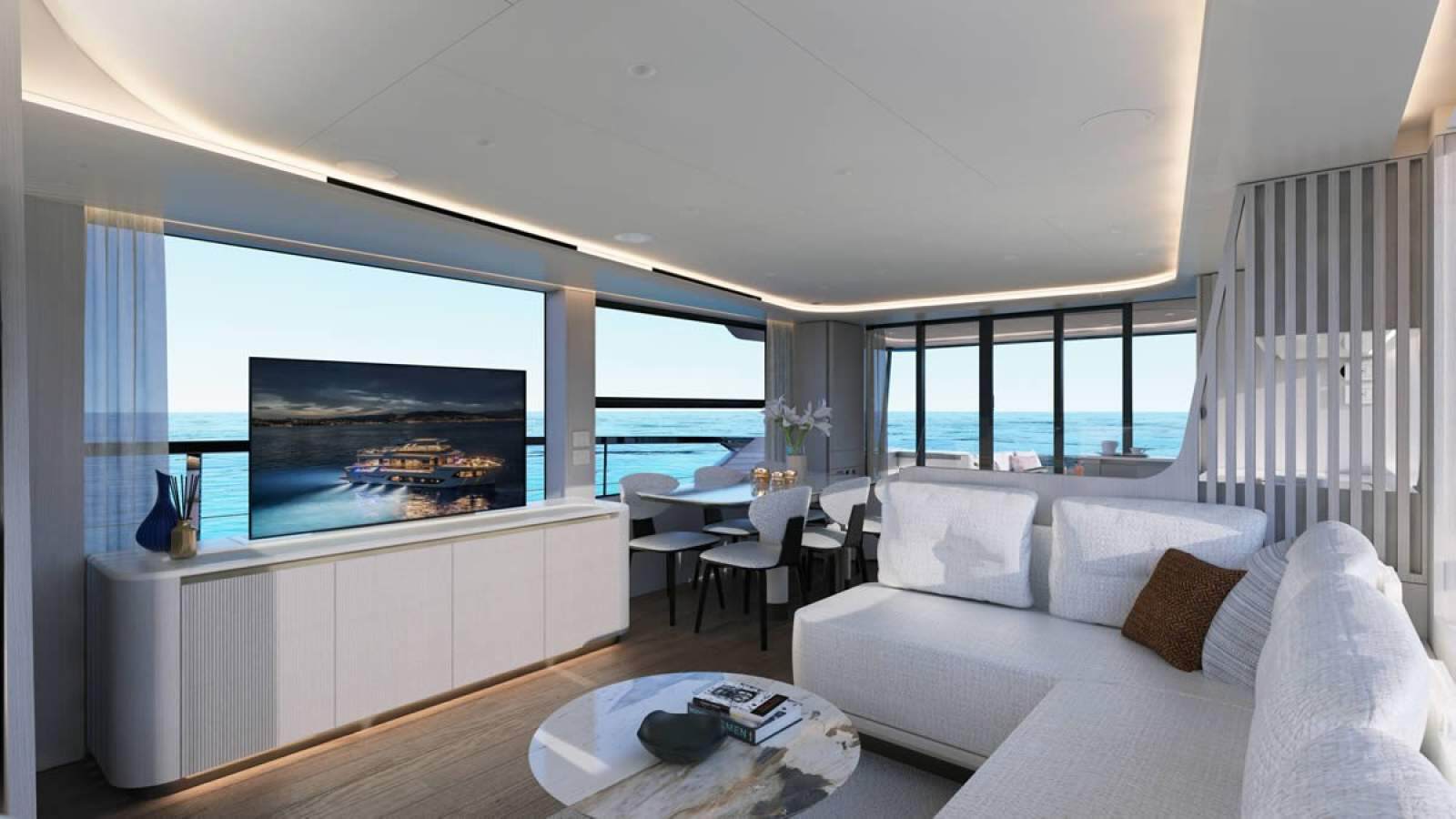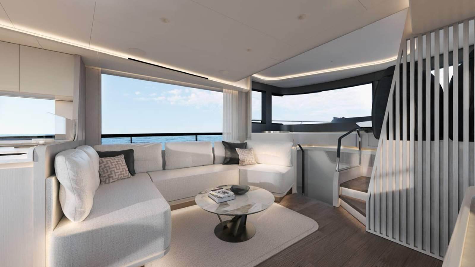 The versatility of the outdoor spaces, with modular furniture that adapts to any occasion, allows the environment to transform effortlessly-- whether for a peaceful moment of relaxation or an elegant evening under the stars. Premium finishes, such as the glazed stern platform and sleek integrated LED strips, add a refined modern touch, making every outdoor corner an ideal spot for conviviality and relaxation.