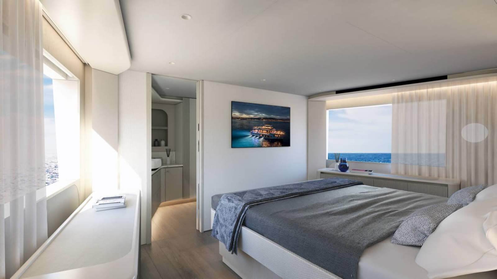 The living area is a celebration of comfort: an electrically adjustable table and plush sofas, reminiscent of the warmth and familiarity of home, turn every occasion onboard into a relaxing and memorable experience. Yet it is in the cabins where the Navetta 62 truly unveils its luxurious character. Each cabin is a haven of complete tranquillity, designed to provide maximum privacy and comfort. The owner's cabin, located forward, epitomizes sophistication with a king-size bed, ample storage space, and exquisite finishes. The full-height pleated curtains further enhance the room's elegance. Both the VIP and guest cabins offer generous spaces, with comfortable beds and meticulously curated furnishings. Each cabin is conceived to create a serene and peaceful atmosphere, ensuring that every night spent onboard is an uncompromising experience of luxury.