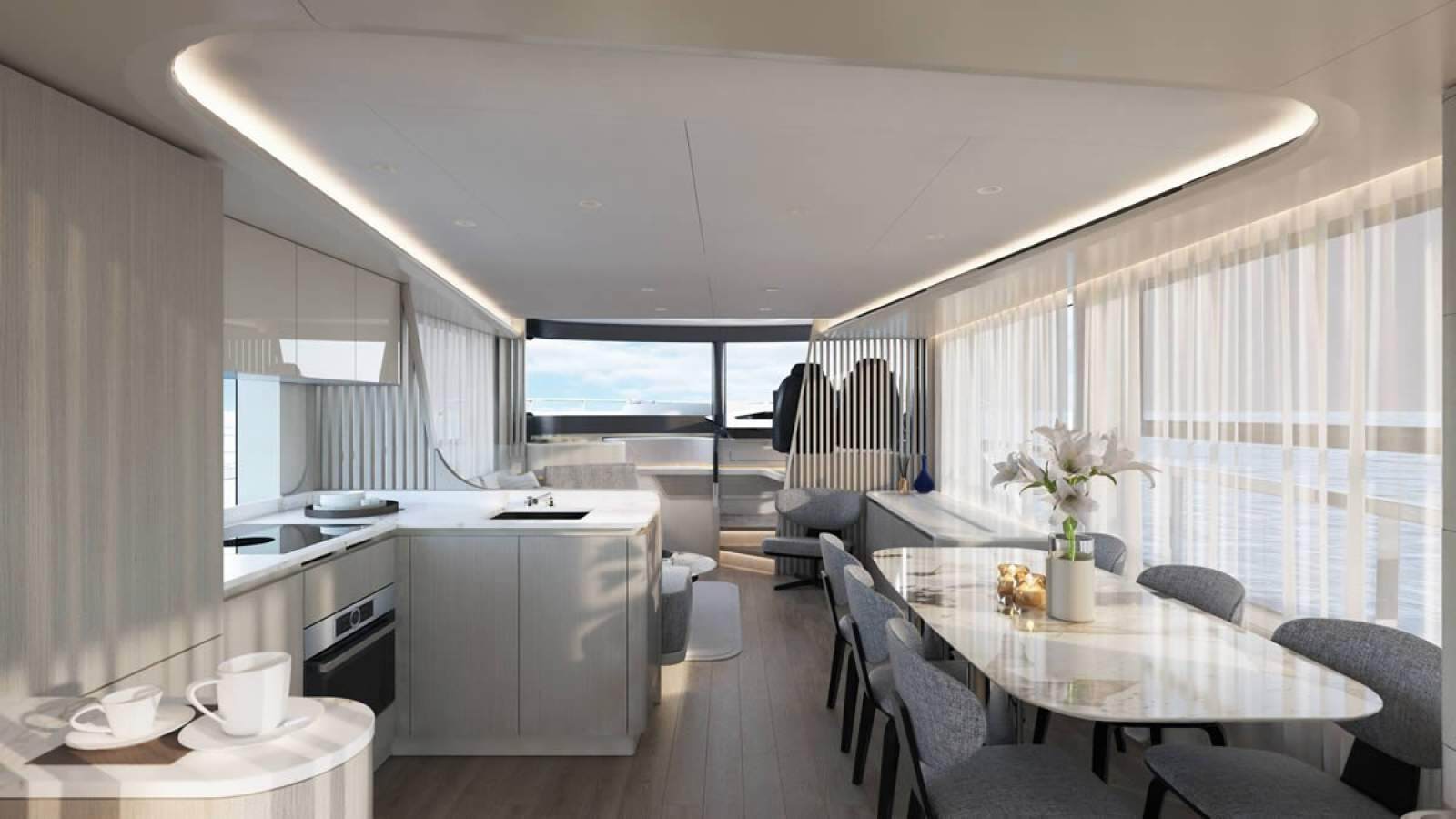 Inside the Navetta 62, luxury and sophistication come together in a welcoming and luminous space, where every detail has been thoughtfully designed to enhance the onboard experience. High-quality furnishings are complemented by elegant finishes, creating a refined yet inviting atmosphere. Special attention has been given to the new floor-to-ceiling pleated curtains, which elevate the interior elegance and add a sense of spaciousness and lightness. The open kitchen, equipped with modern appliances and a cooktop with an integrated extractor hood, offers a perfect blend of functionality and style, seamlessly flowing into a living area designed for moments of pure conviviality.
