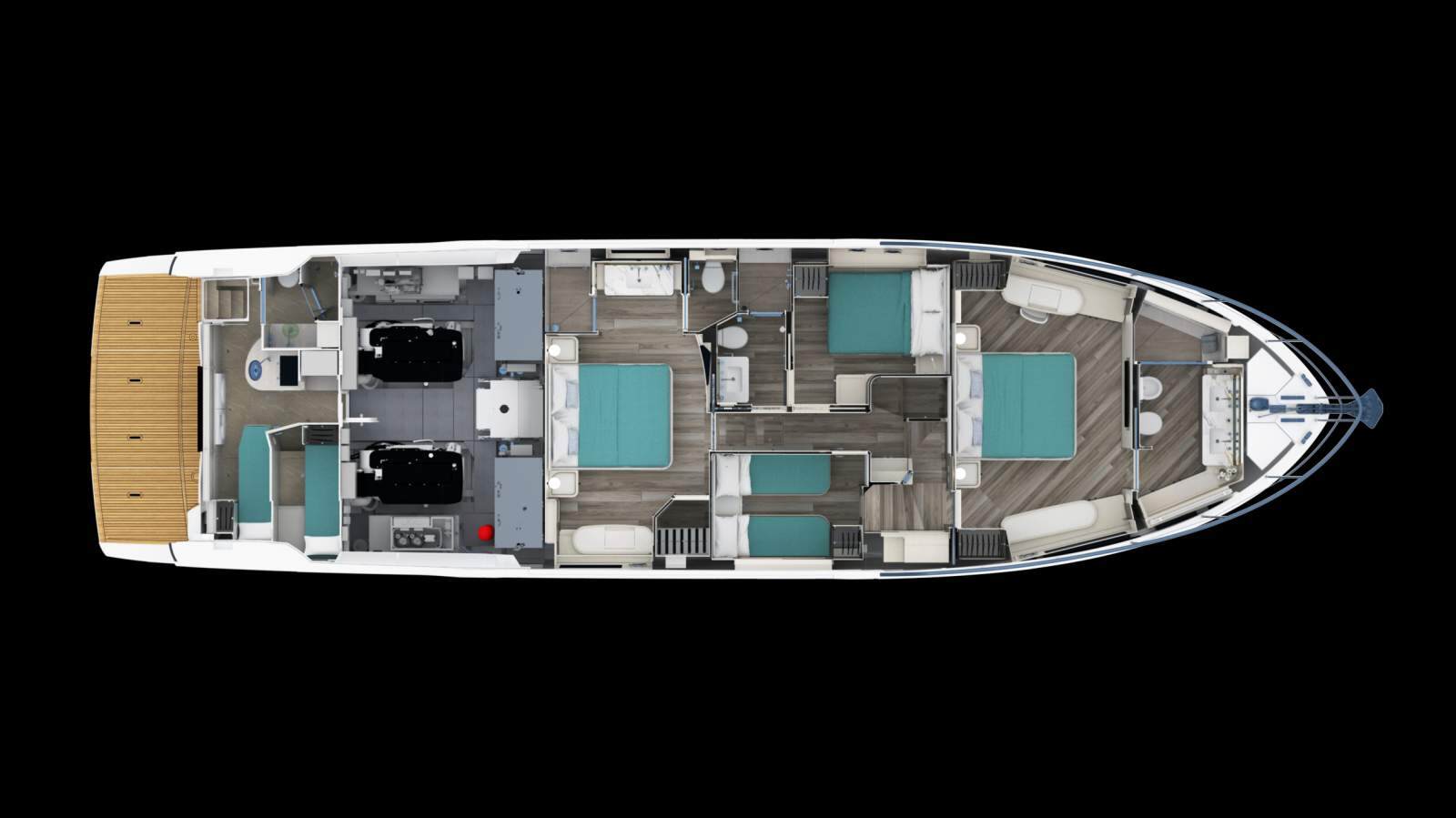 The exterior spaces of this yacht are distinguished by dynamic and captivating lines, featuring a spacious and redesigned flybridge and a comfortable terrace cockpit.