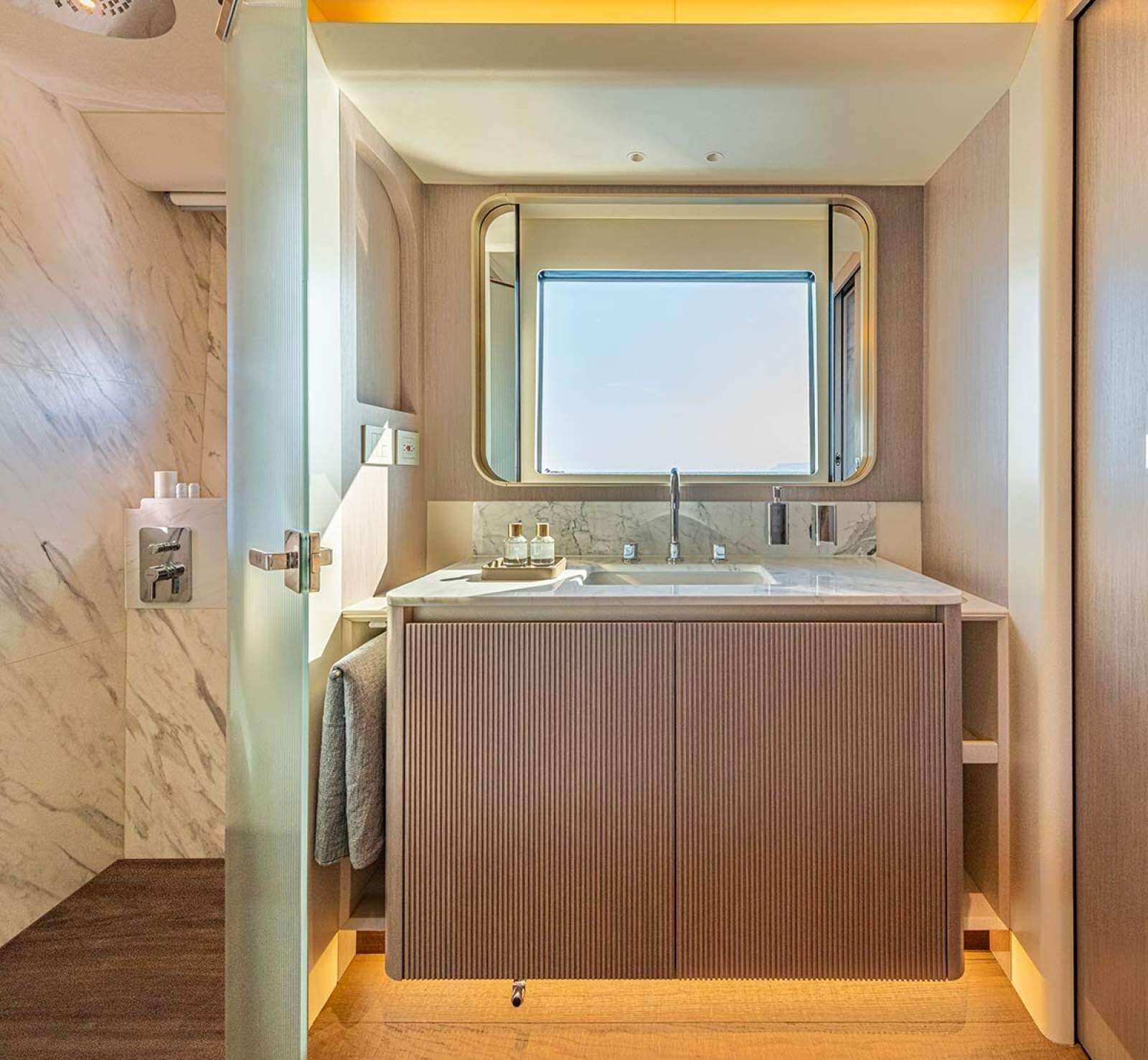 This yacht has also been designed to enjoy a 360-degree view of the sea on board, with the perception of being on a vessel with much larger volumes. The spacious kitchen and the ample lounge further contribute to the impression of even more generous spaces.