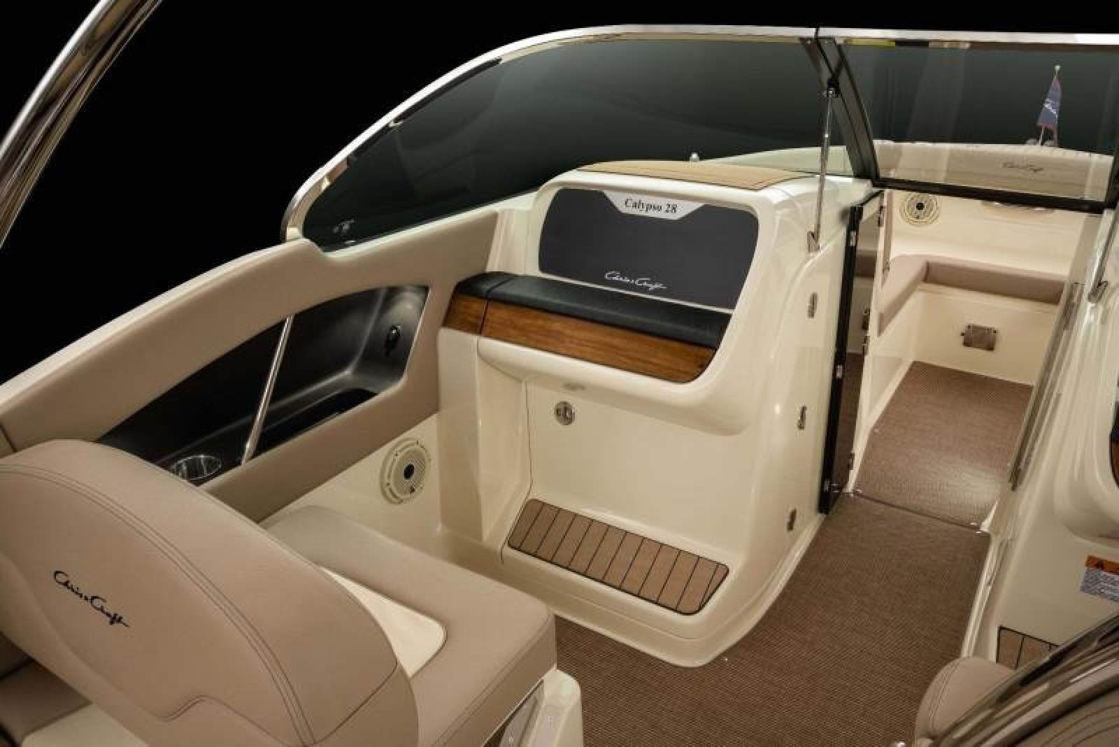 CRUISE IN STYLE - The Calypso 28 offers ample space and all the essential amenities for hosting memorable excursions. For easy access to the dock and the water, a starboard side-boarding door and extended swim platform are both standard. Select the Heritage Edition to enjoy teak accents throughout, including the covering boards, the swim platform, and a full teak floor.