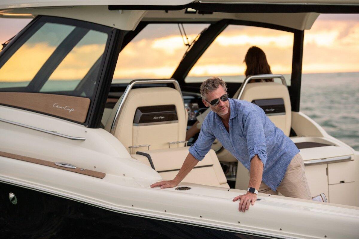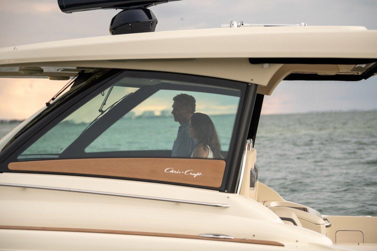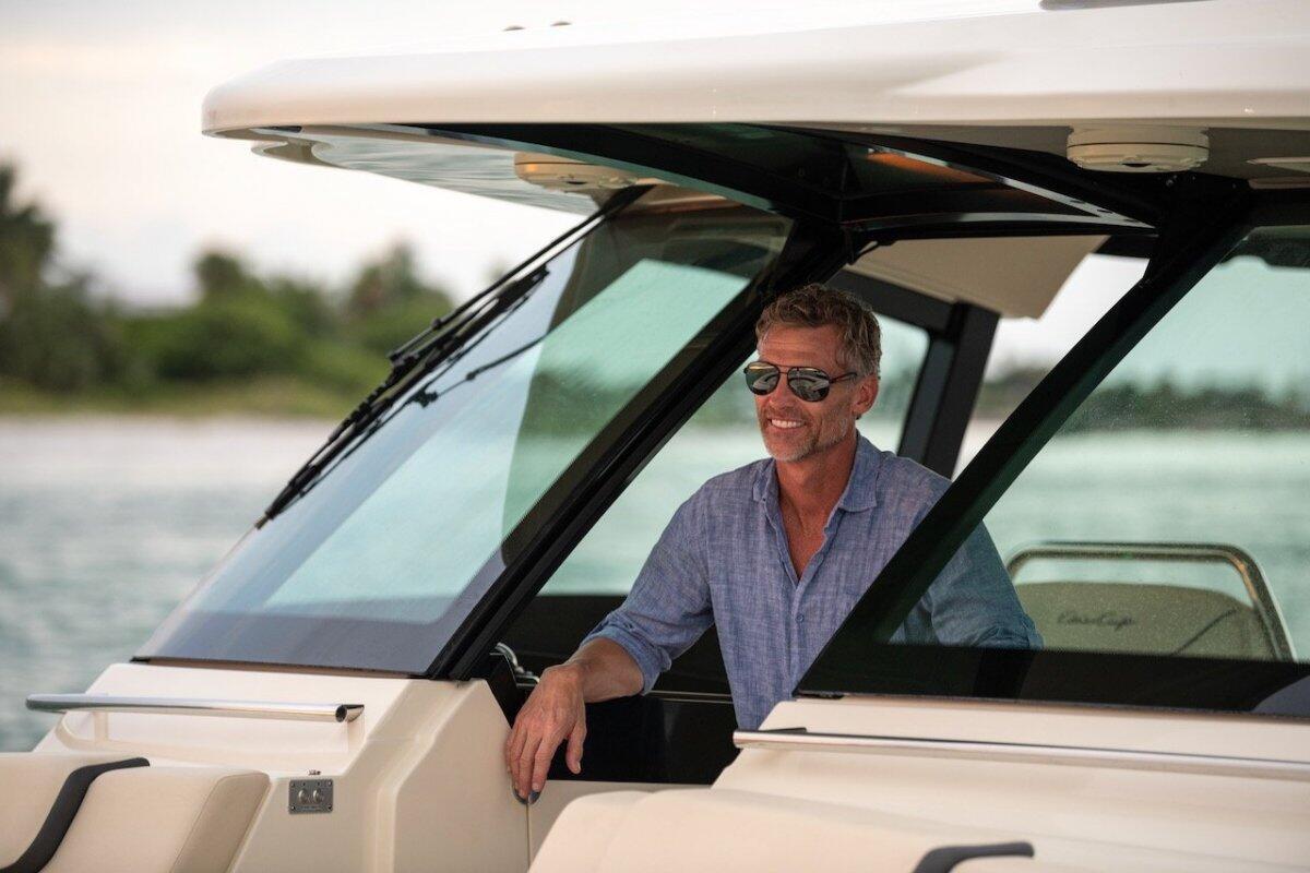 The Calypso 35 debuts our new fully enclosed windshield with a power actuated center walk-through and sliding wind door. When the windshield opens, it encloses into the hard top, creating unobstructed views through both driver and passenger sides. With an optional helm air conditioning and heat system, the Calypso 35 offers maximum comfort for a great day on the water.