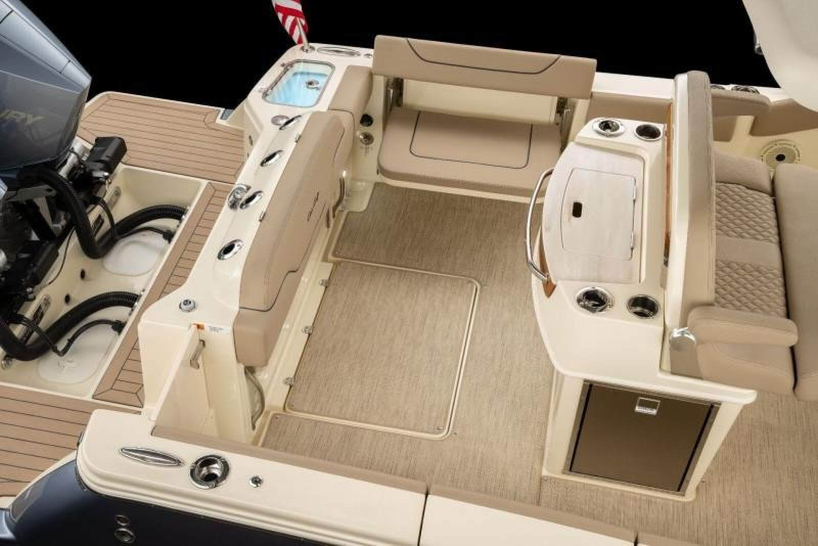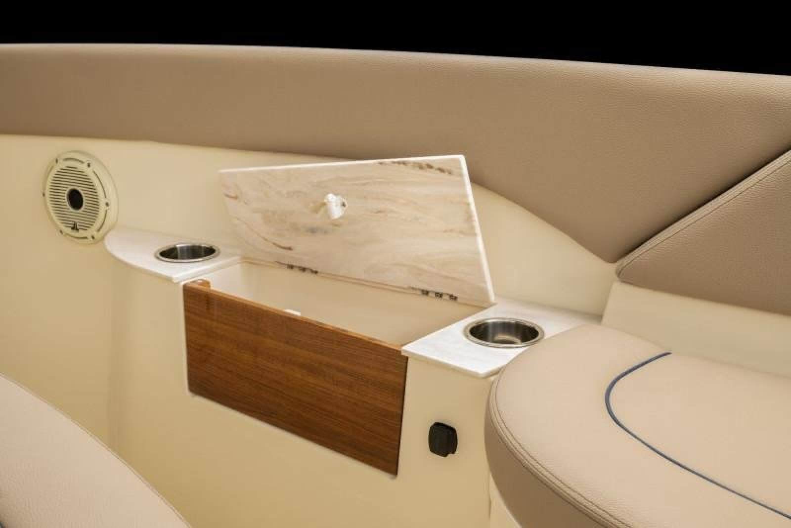 ELEVATED ENTERTAINING - With its rich wood and stainless steel accents, the optional cockpit galley is sleek and practical. Breeze through everything from prep to cleanup with a drawer refrigerator, ample drawer storage, a freshwater sink, and a tip-out trash receptacle. The galley also pairs with a wide helm seat featuring flip-up armrests and bolster for the captains comfort.