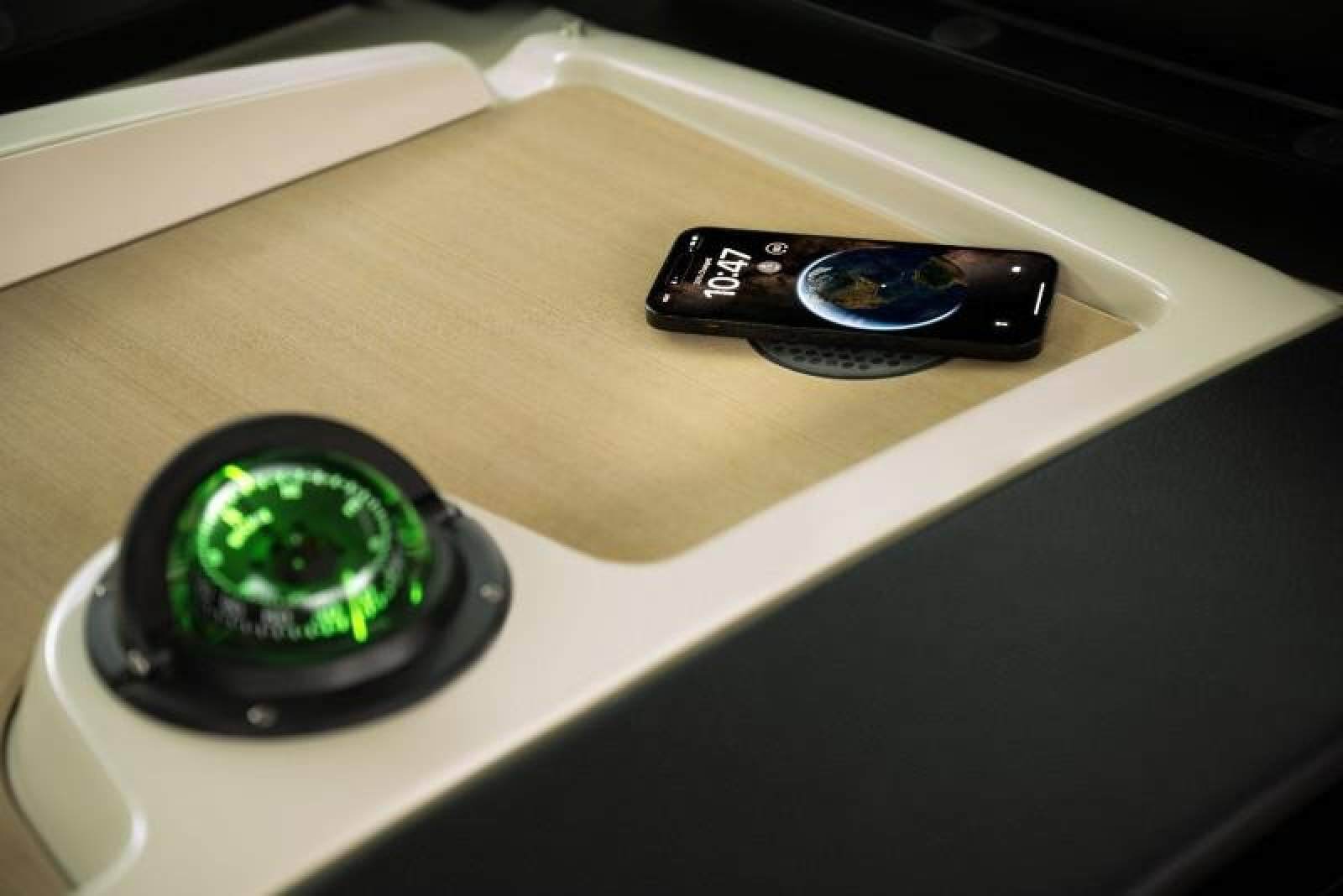 BEAUTIFULLY APPOINTED - A classic high-gloss teak steering wheel centers the space, which includes a flush-mounted 12inch Garmin display with CZone switching. A port display replaces the glove box when you opt for dual 12inch displays. Positioned at the helm, an inductive phone charger and powered USB ports await your devices.