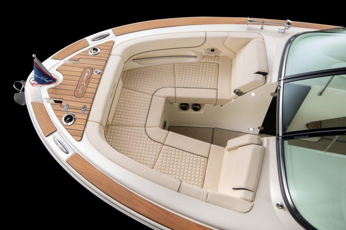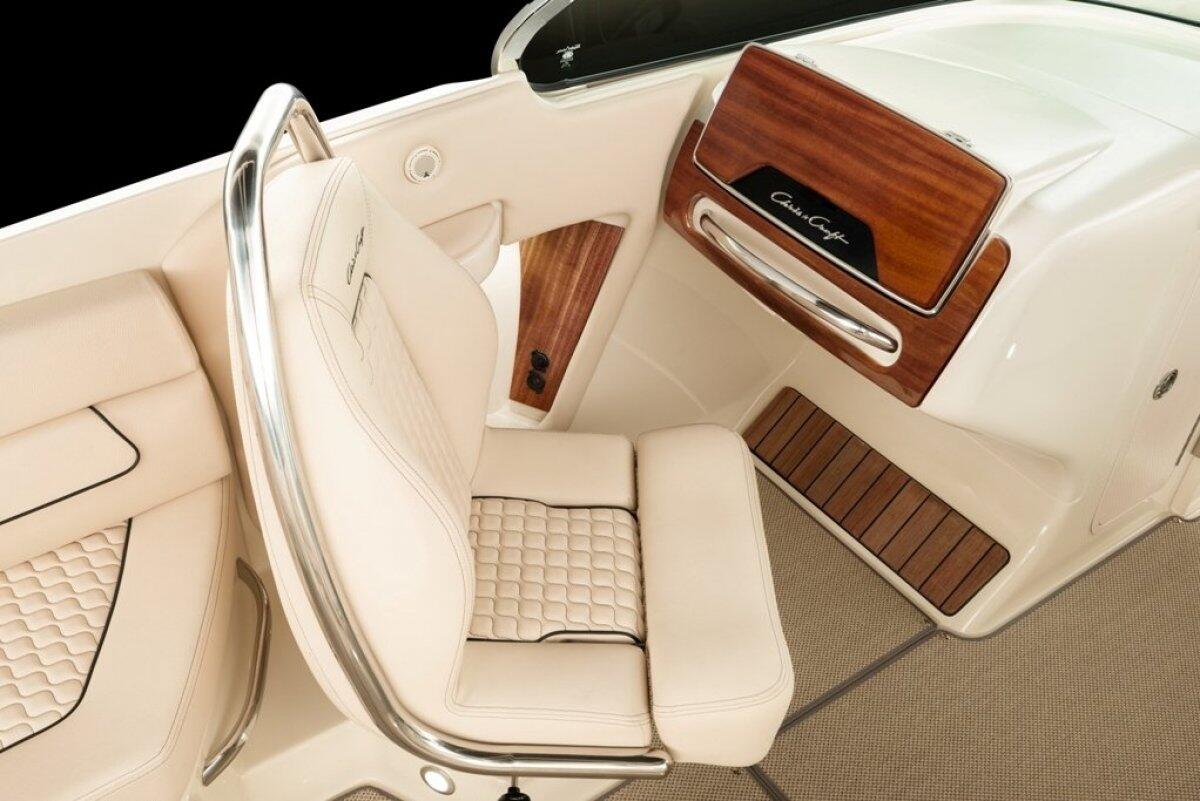- Flush mounted chrome electronic dash with depth sounder, 10" Garmin display, Chris Craft branded electronic controls