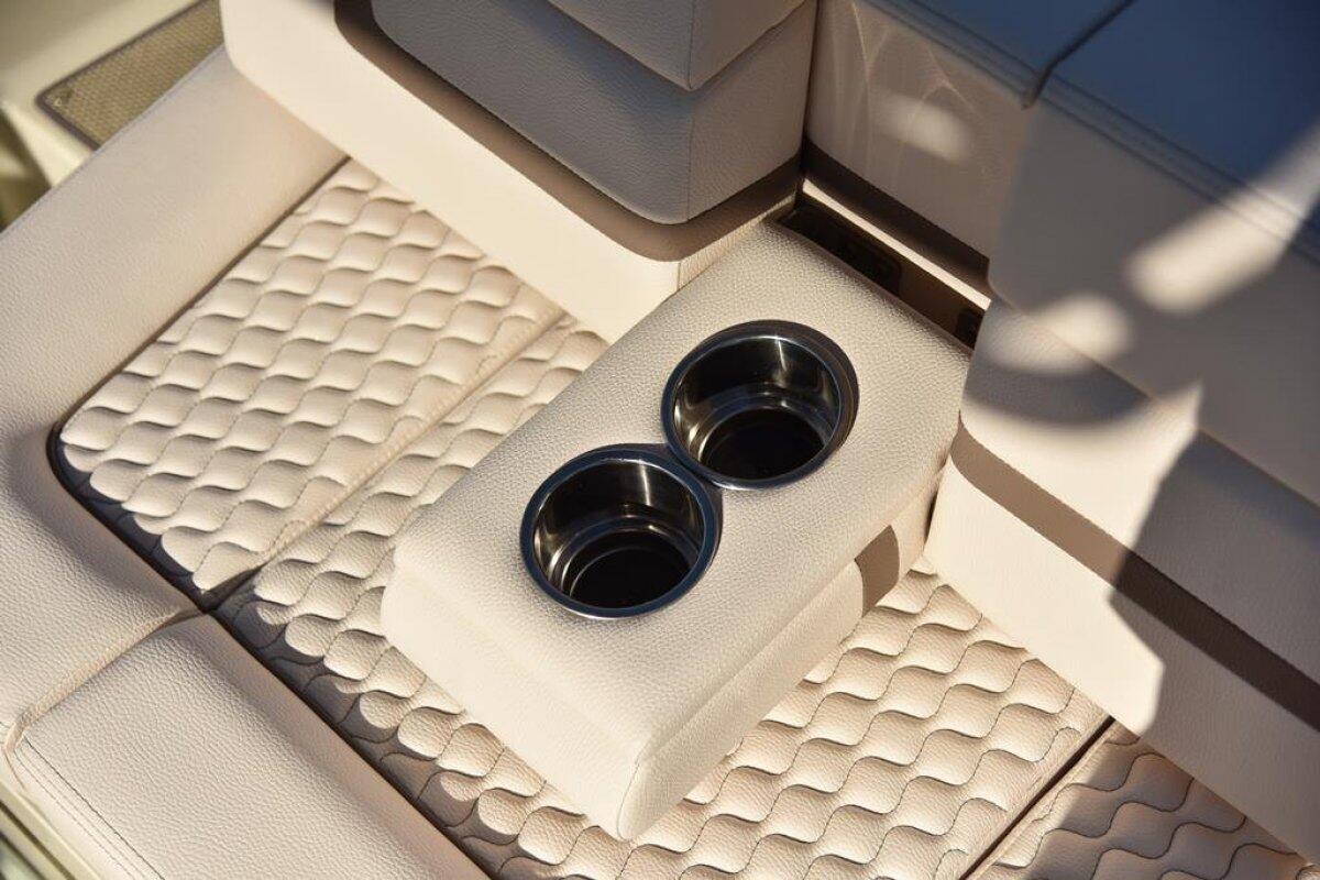 A big feature of the new Launch 28 GT is a new, convertible, walk-through transom with a reversible sunpad that, at the press of a button, moves fore and aft for lounging. It can also create additional impromptu seating for extra crew while underway.