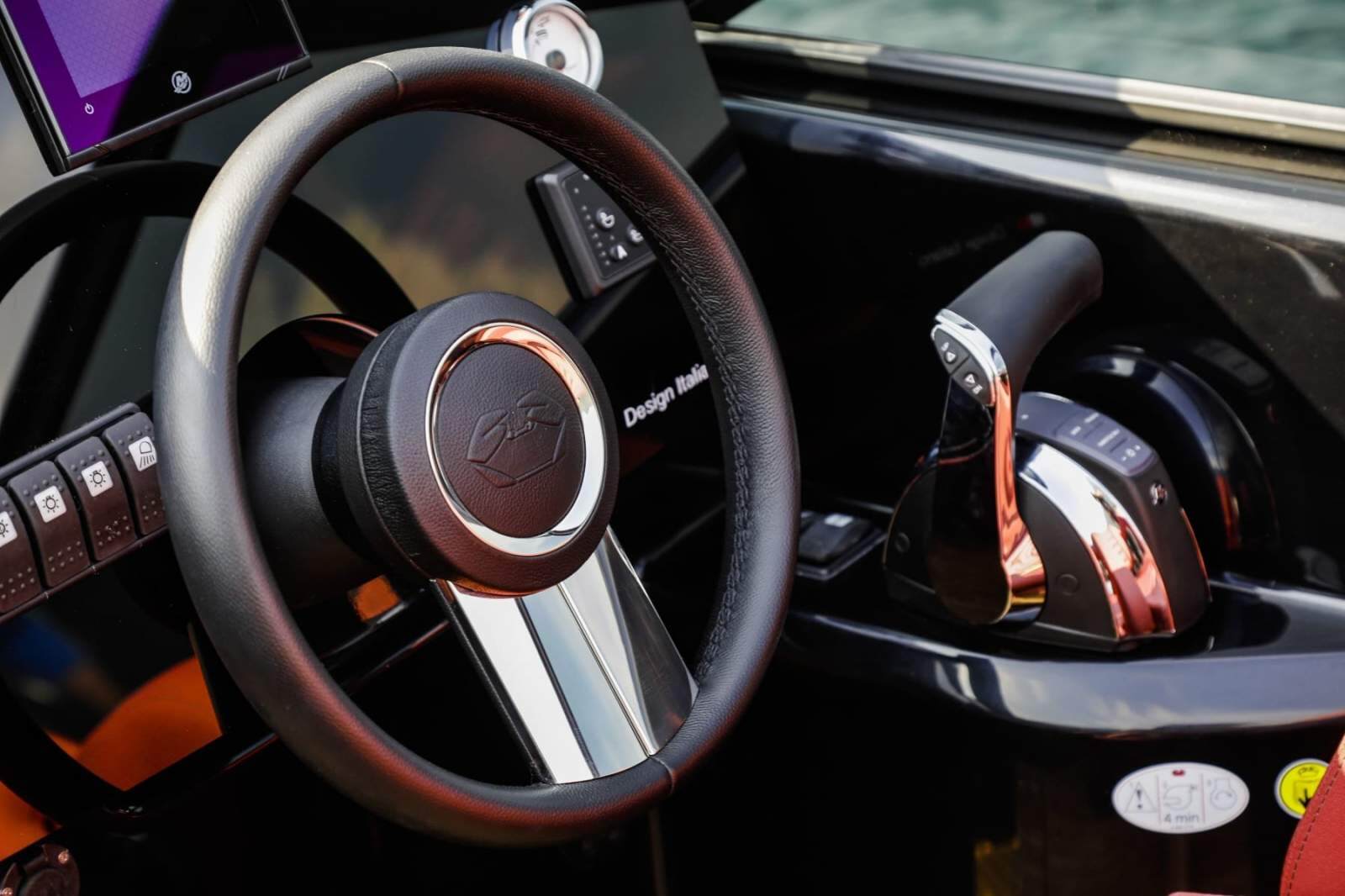 An on-board experience which satisfies your desires - Ideal for moving around with style and speed, as well as carrying around wakeboards or other toys, the E26 Rider is a vessel which will also be appreciated close to shore. With perfect symmetry, two comfortable sofas which convert into a large sundeck face each other from the two bulwarks. The skipper and co-skipper's seats pivot and can be turned towards the sofas to further extend the socialisation area. The on-board comfort and well-being are enhanced by refined and functional details. Beside the pilot console, to the left, is a sink and head.
