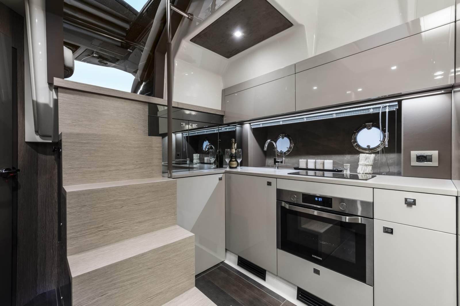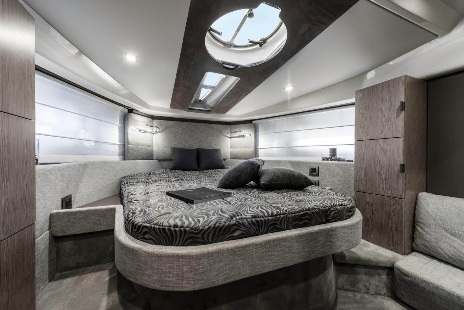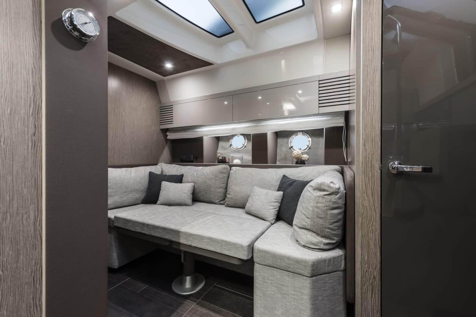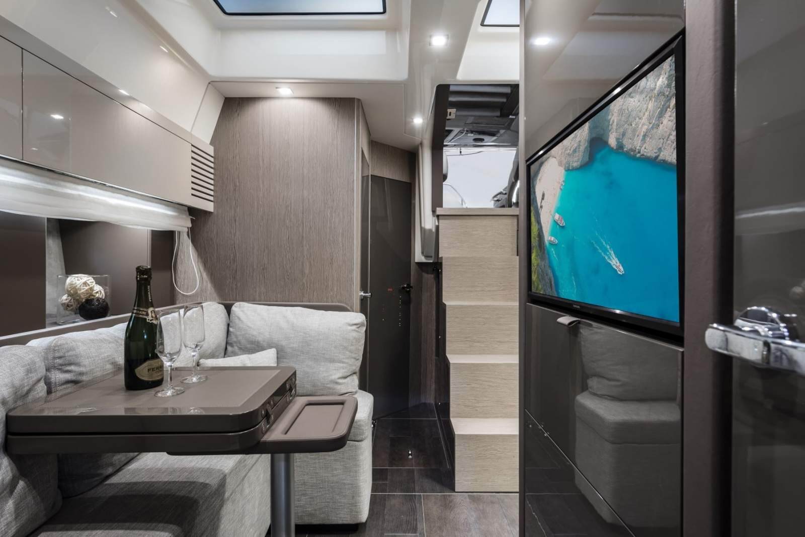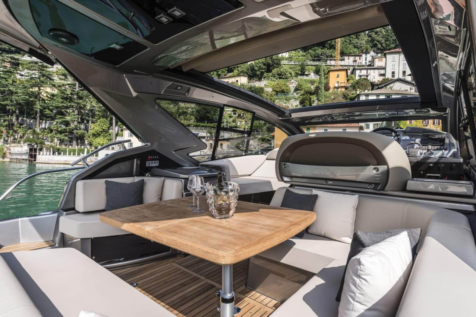 Cleverness combines with simplicity - The soft top provides maximum protection to the cockpit, at the same time offering a large opening which transforms the Cranchi M44 HT into an authentic open top when required. When you wish to be more sheltered, on the other hand, the excellent insulation of the roof creates a warm and closed space. The top covers the dinette which is back of the pilot station, while on the left is the galley unit and the chaise-longue which makes use of the roof opening for sunbathing.