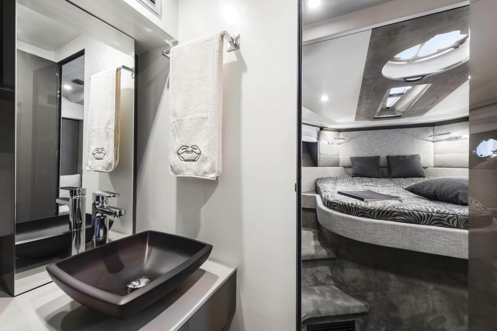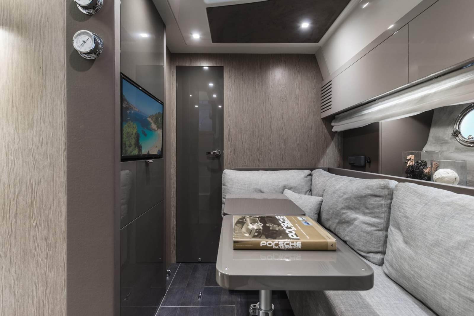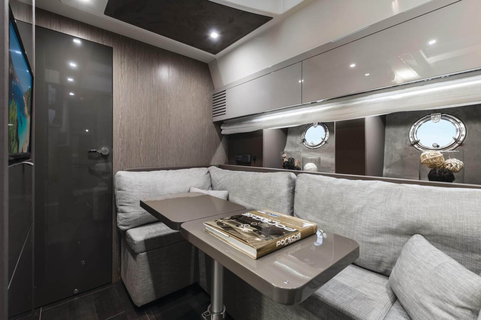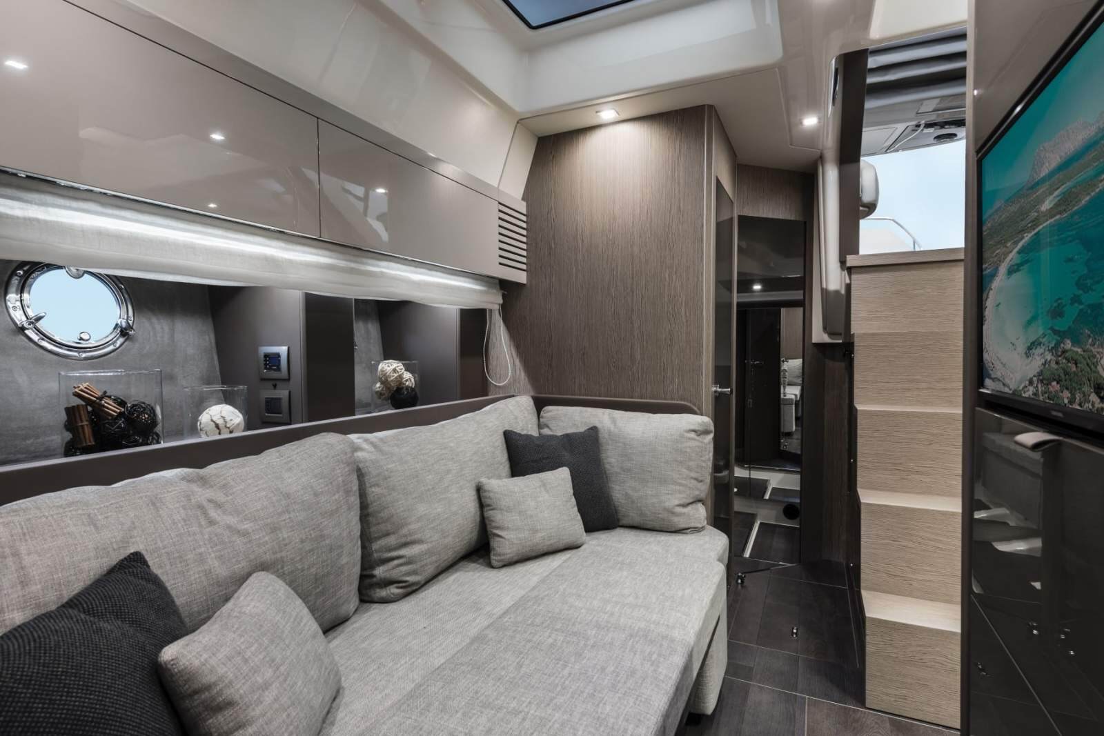 Cleverness combines with simplicity - The soft top provides maximum protection to the cockpit, at the same time offering a large opening which transforms the Cranchi M44 HT into an authentic open top when required. When you wish to be more sheltered, on the other hand, the excellent insulation of the roof creates a warm and closed space. The top covers the dinette which is back of the pilot station, while on the left is the galley unit and the chaise-longue which makes use of the roof opening for sunbathing.