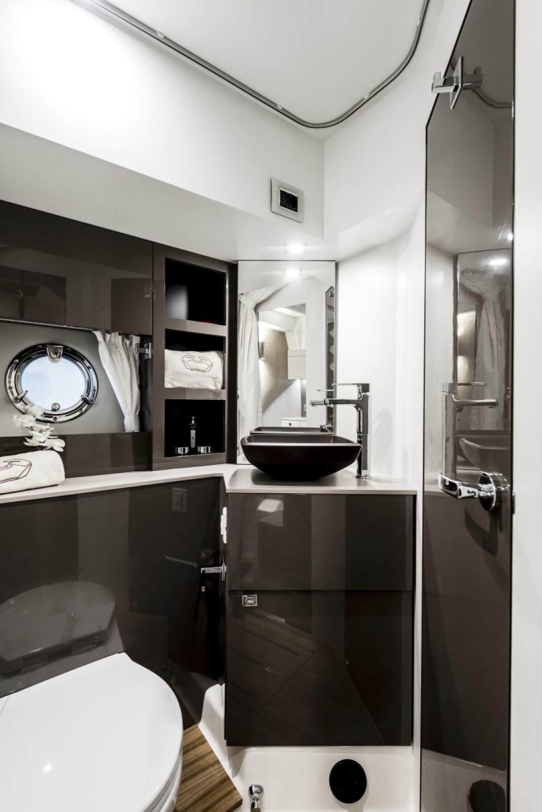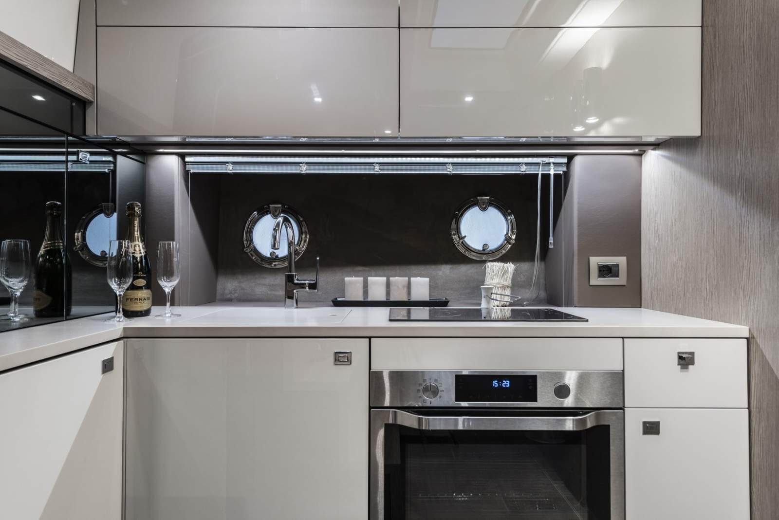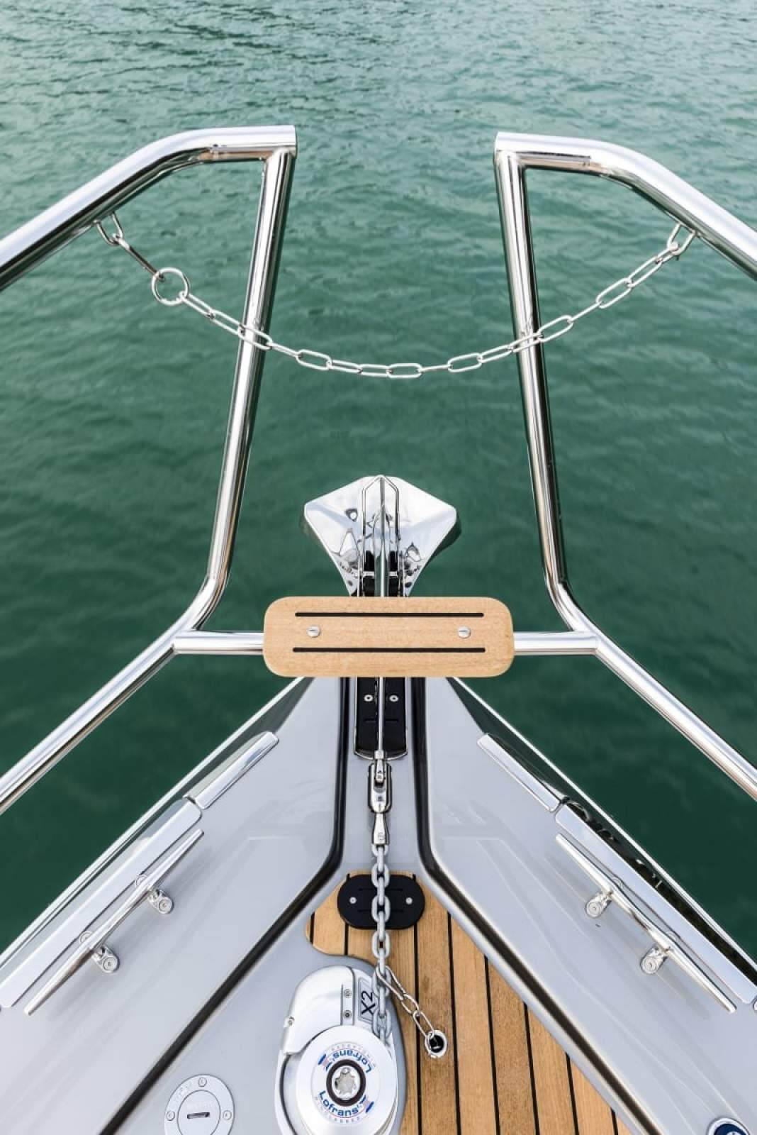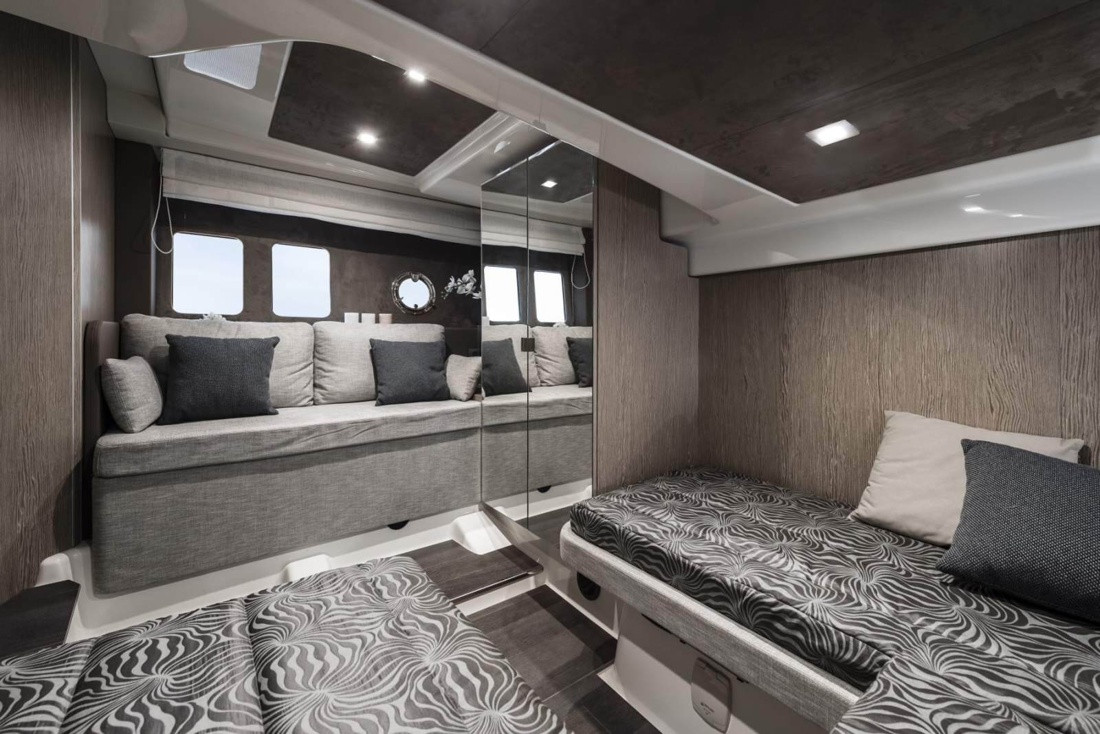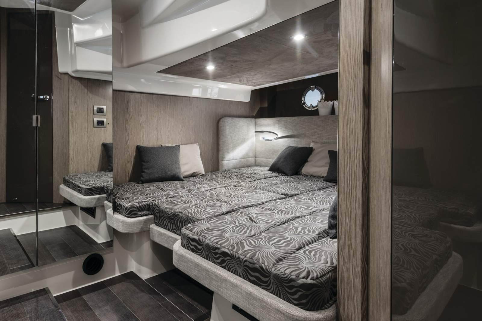 Cleverness combines with simplicity - The soft top provides maximum protection to the cockpit, at the same time offering a large opening which transforms the Cranchi M44 HT into an authentic open top when required. When you wish to be more sheltered, on the other hand, the excellent insulation of the roof creates a warm and closed space. The top covers the dinette which is back of the pilot station, while on the left is the galley unit and the chaise-longue which makes use of the roof opening for sunbathing.