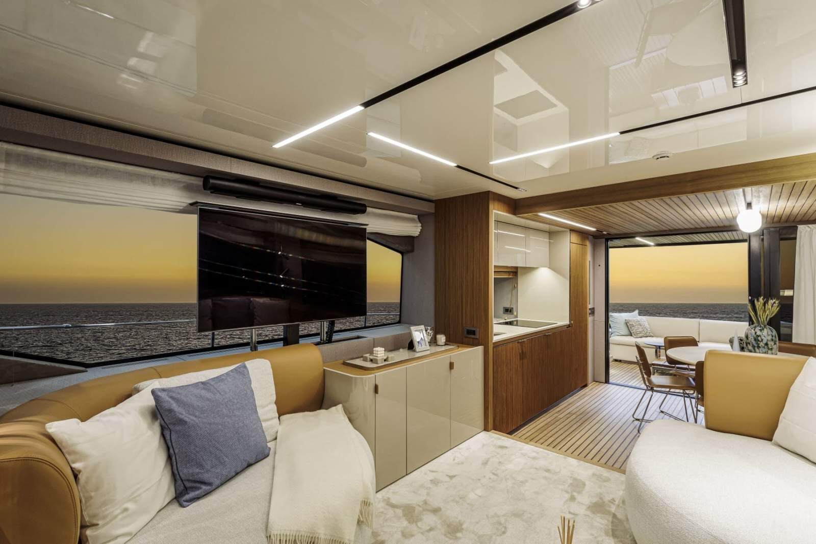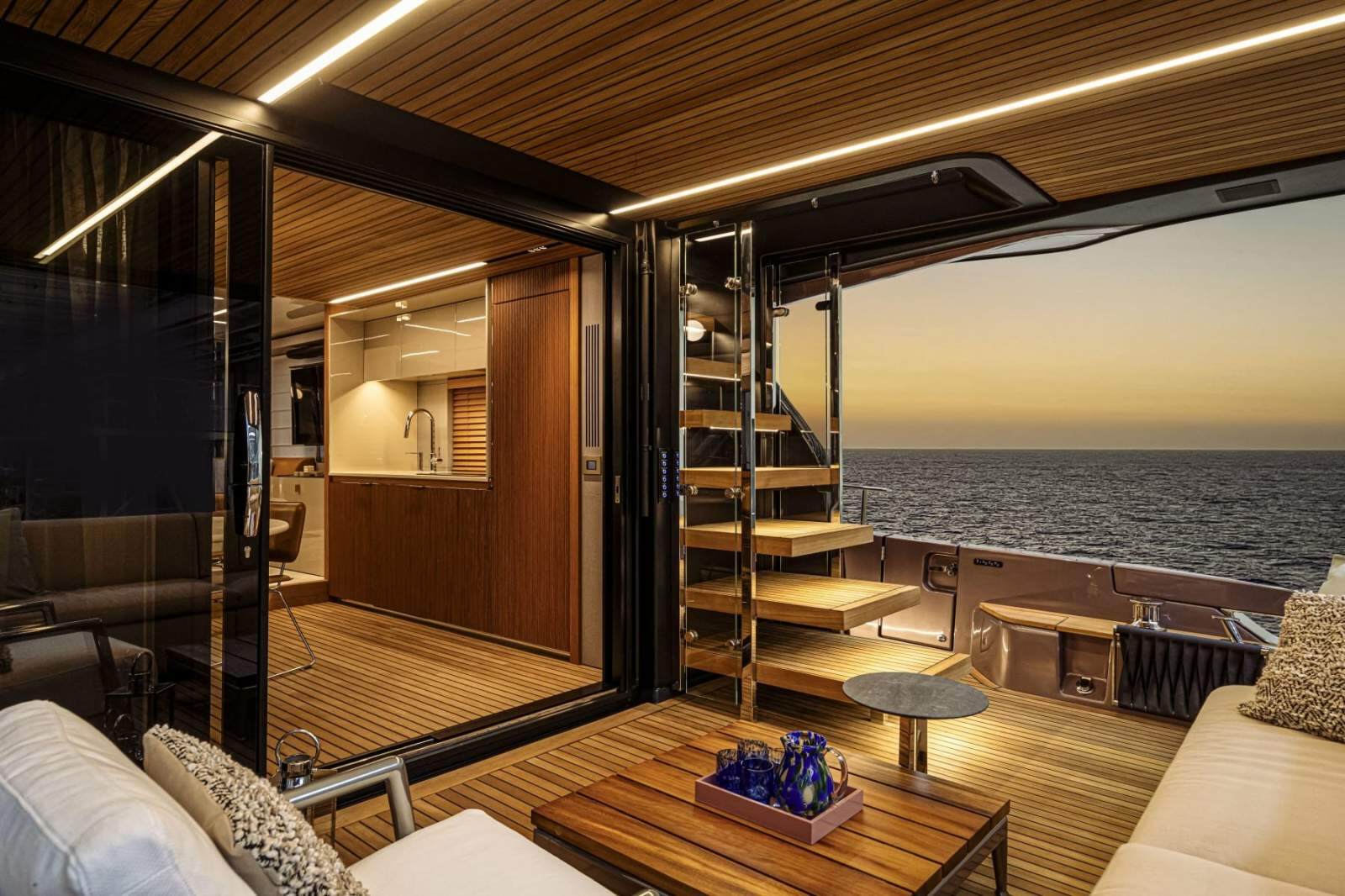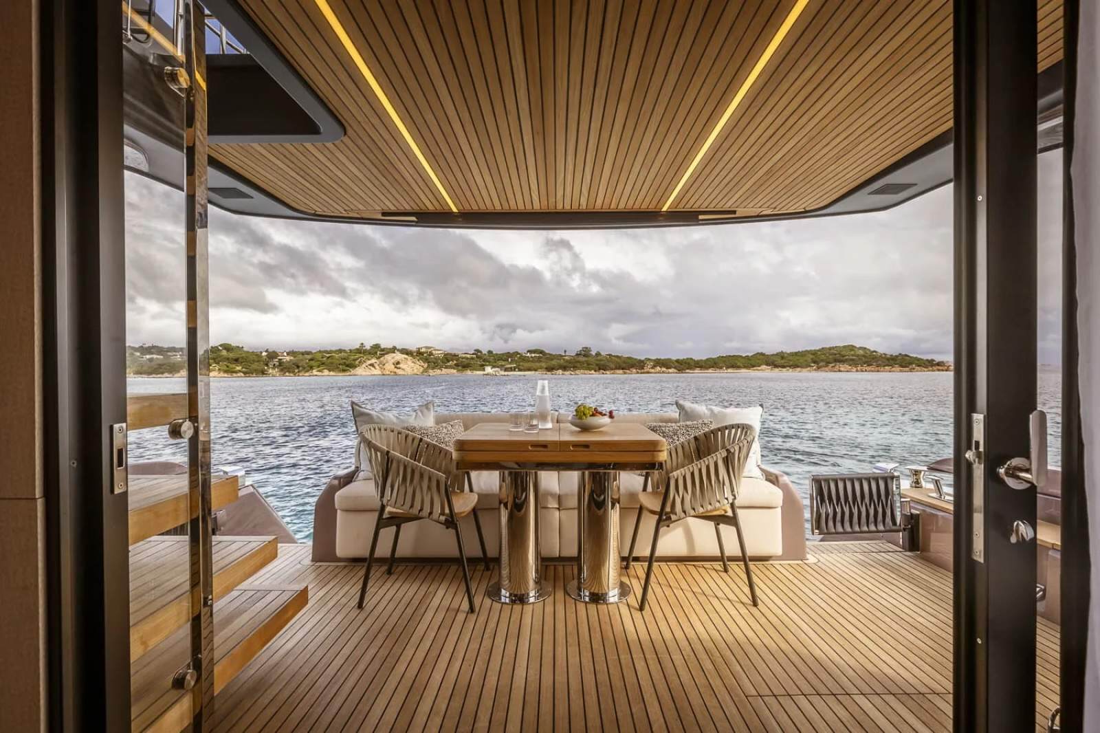 Perfect continuity between the inside and outside - On the Sessantadue 62, the boundary between the cockpit and saloon seems to disappear: on each side of the double sliding glass door, both the floor and ceiling are covered in teak, providing the impression of a single large veranda where spaces merge and expand outwards. Continuing in the interior of the main deck and then belowdecks, the teak surfaces coexist magnificently with those in light lacquer, and with furnishing and lighting design solutions which convey an immediate sense of well-being and relaxed elegance. You are on the sea, but feel one step from the sky.
