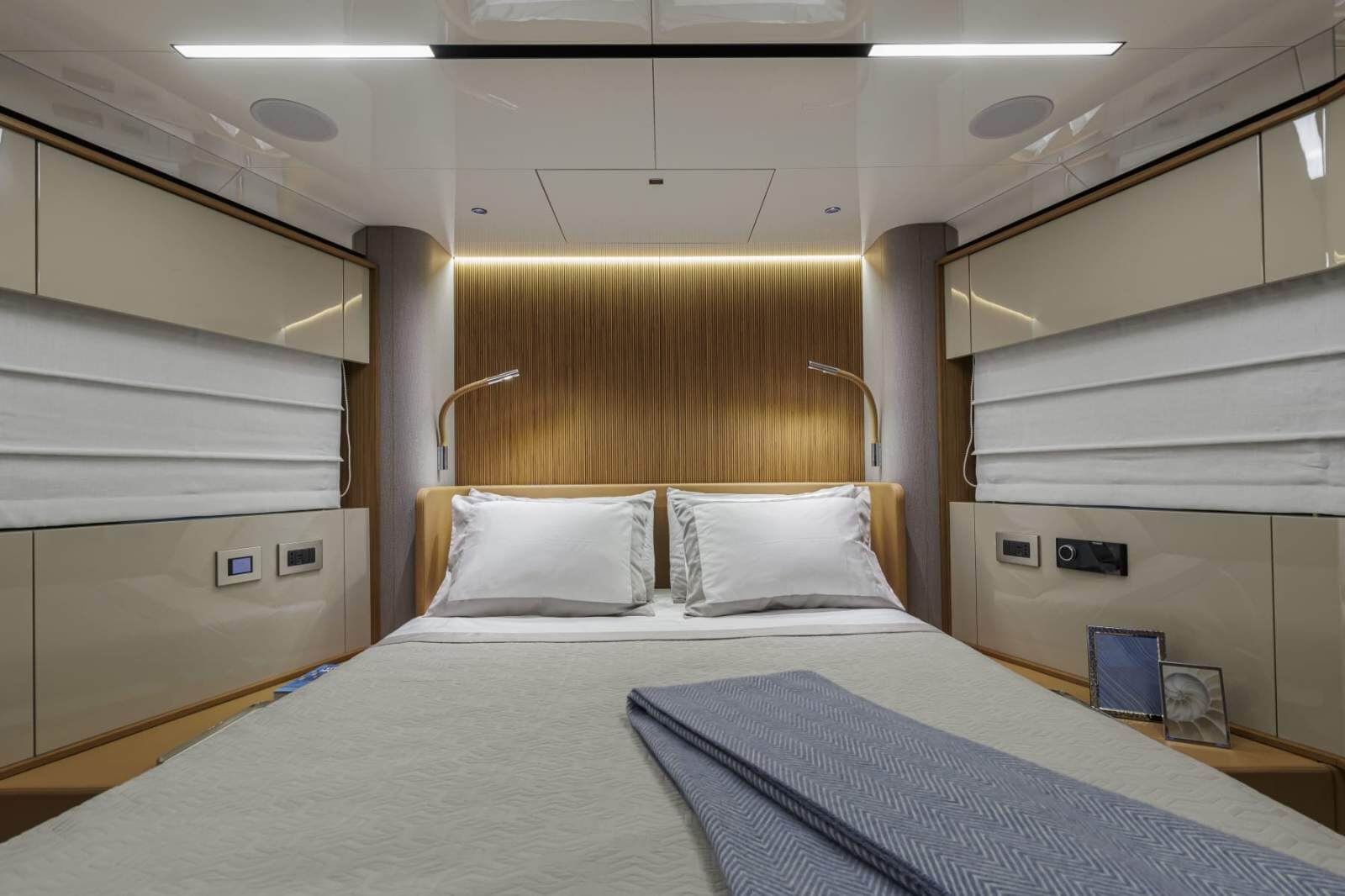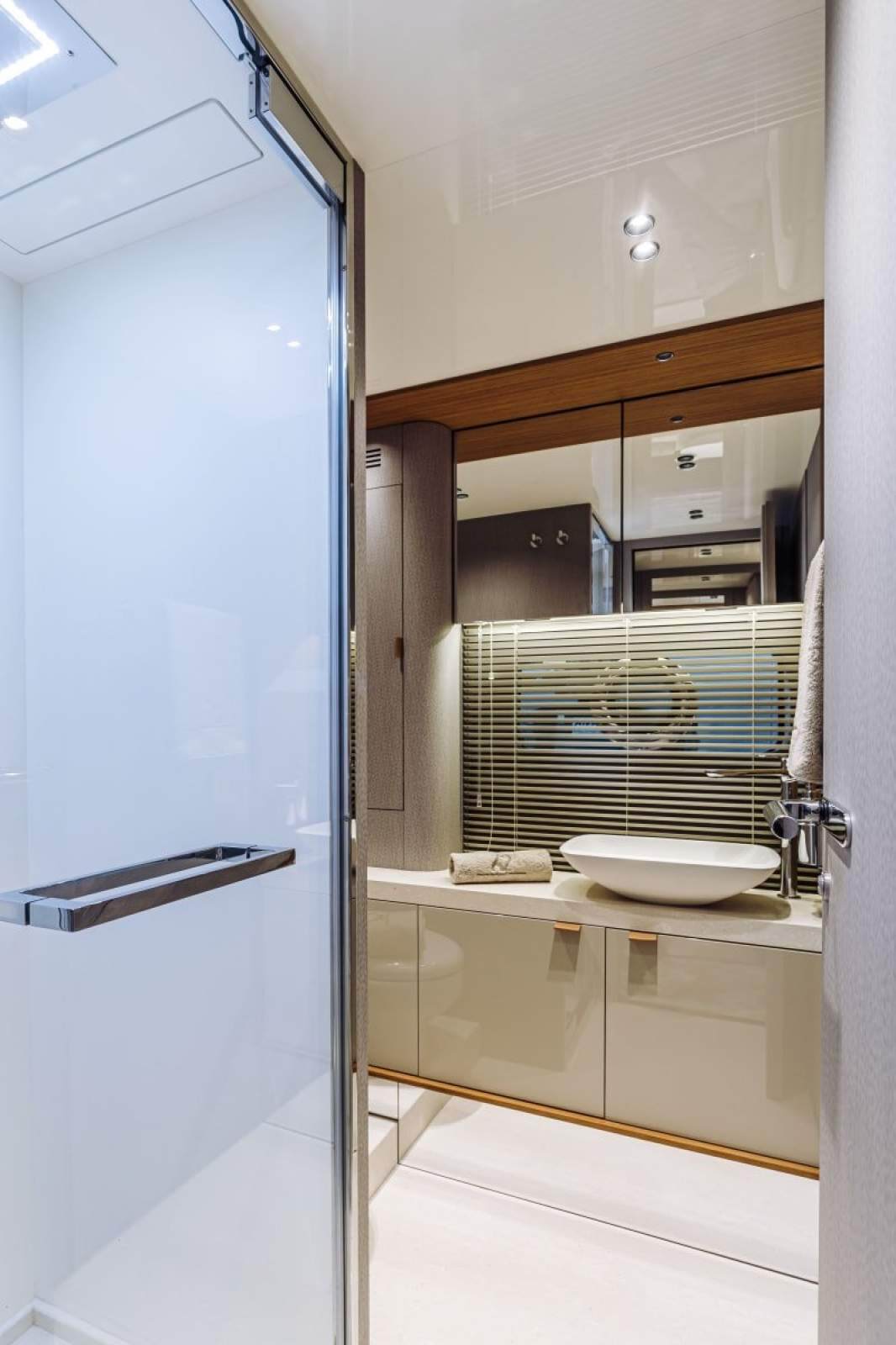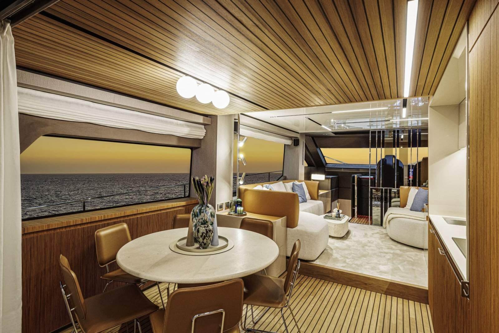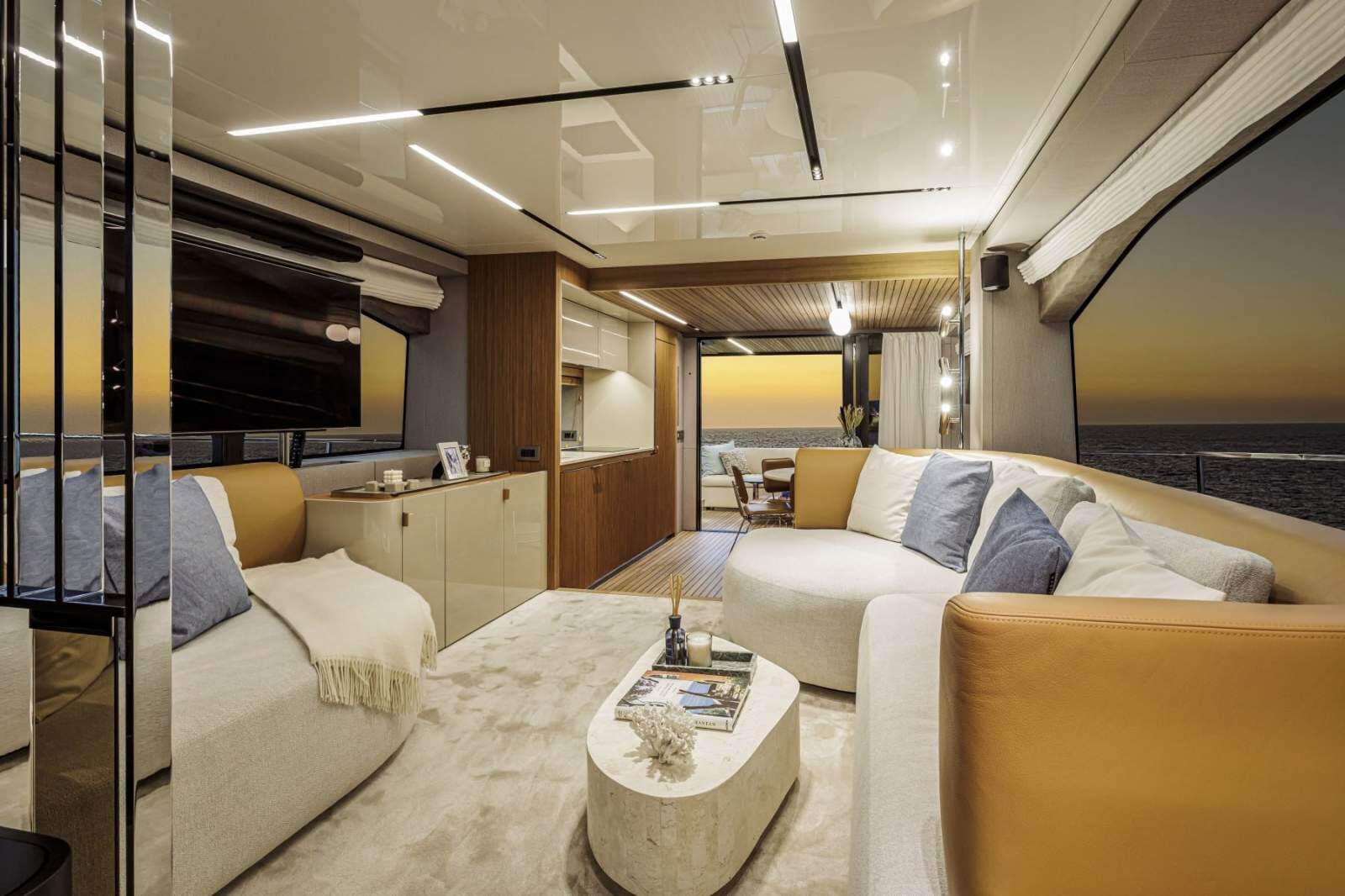 Perfect continuity between the inside and outside - On the Sessantadue 62, the boundary between the cockpit and saloon seems to disappear: on each side of the double sliding glass door, both the floor and ceiling are covered in teak, providing the impression of a single large veranda where spaces merge and expand outwards. Continuing in the interior of the main deck and then belowdecks, the teak surfaces coexist magnificently with those in light lacquer, and with furnishing and lighting design solutions which convey an immediate sense of well-being and relaxed elegance. You are on the sea, but feel one step from the sky.