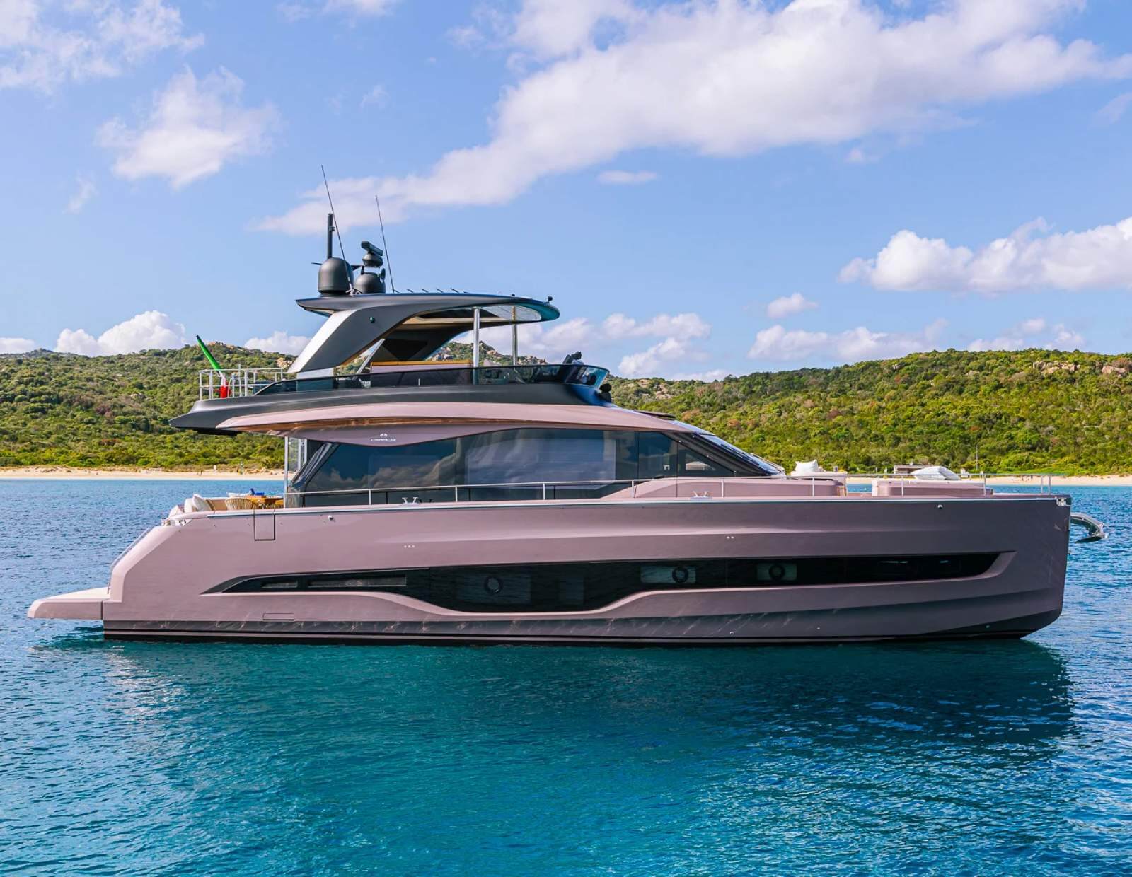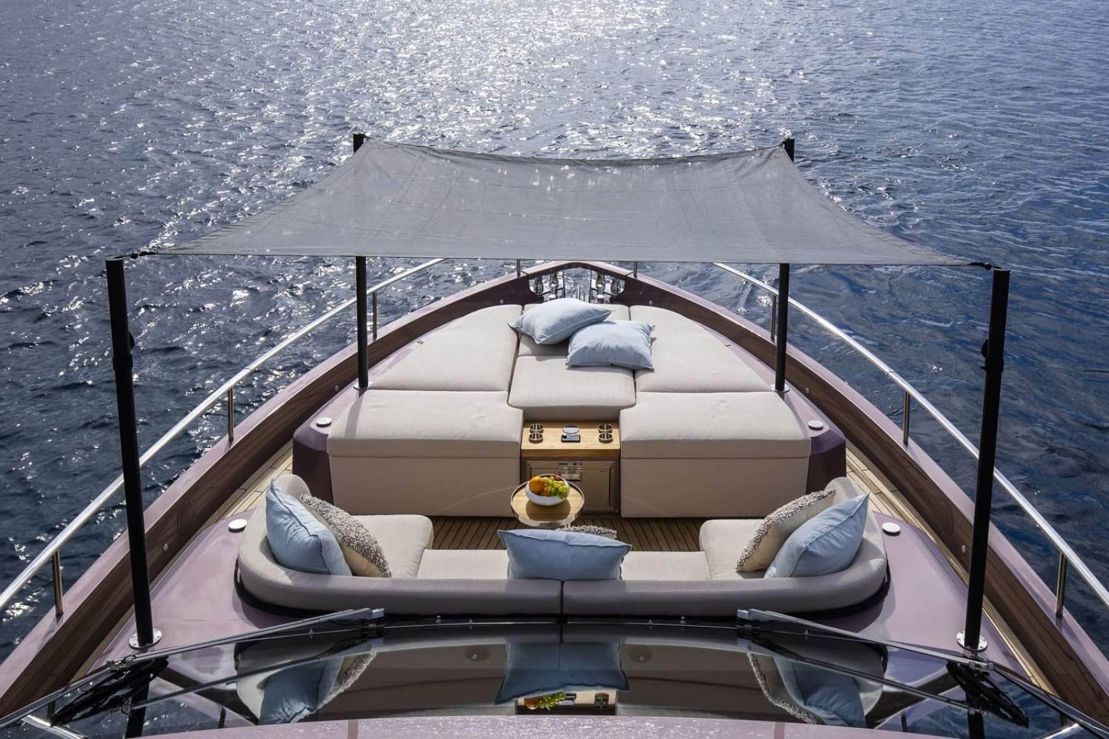 Impossible to look away from right from the very first glance: the design element which first affirms the character of the Sessantadue 62 is its vertical bow. A line which connects the sea and sky, and which accentuates the naval allure of the yacht. The waterline is lengthened, with the vessel benefiting in terms of audacity and muscularity, but without suffering in terms of harmony of forms, which is a distinctive element of Cranchi Yachts' new flybridge models.
