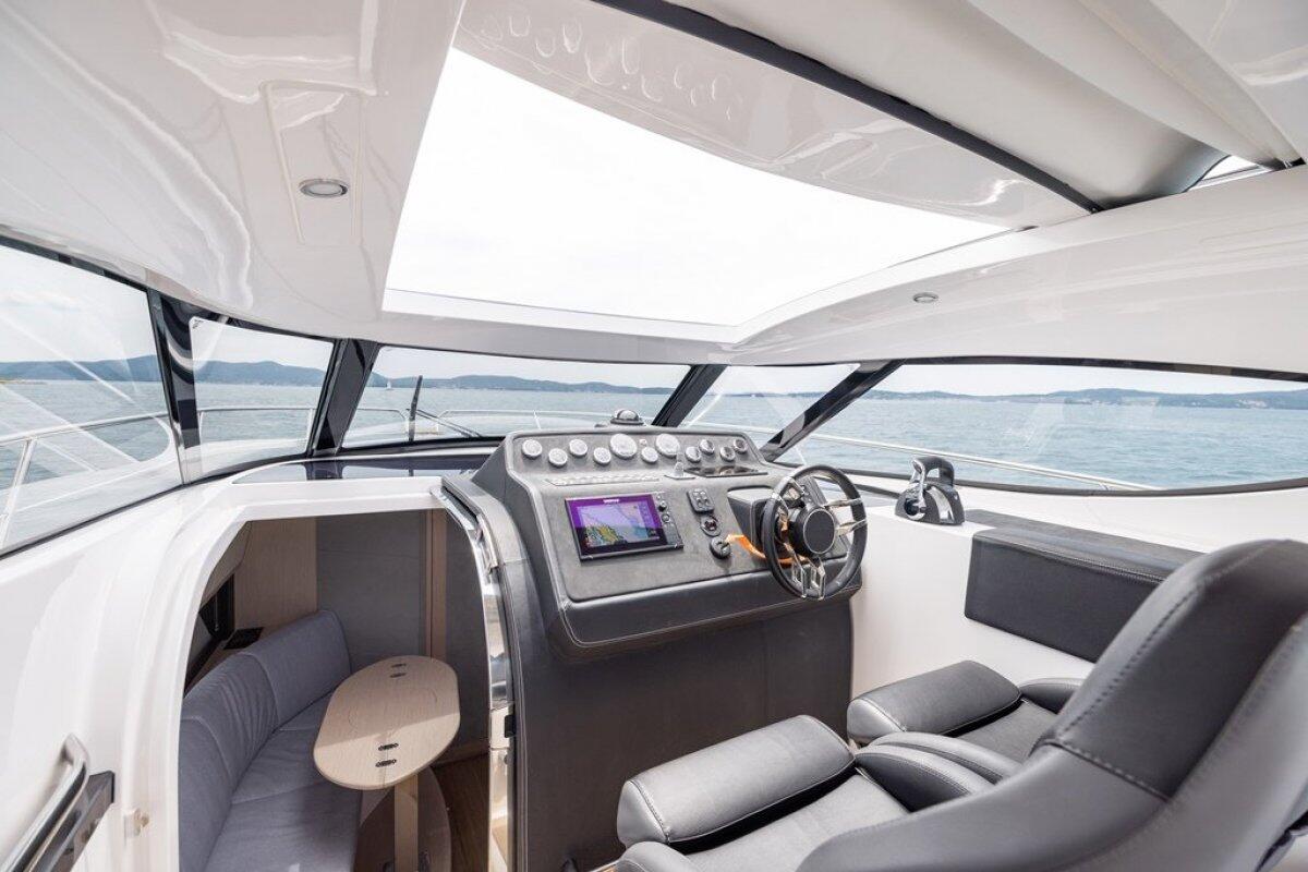 The versatile cockpit is keenly optimised for open-air recreation. In addition to a forward sunbed and secure walkaround side decks, it features a port galley, a six-person dining station, a two-metre sun lounger, an aft 'Beach' and a large canvas sunroof for socialising under the sun.