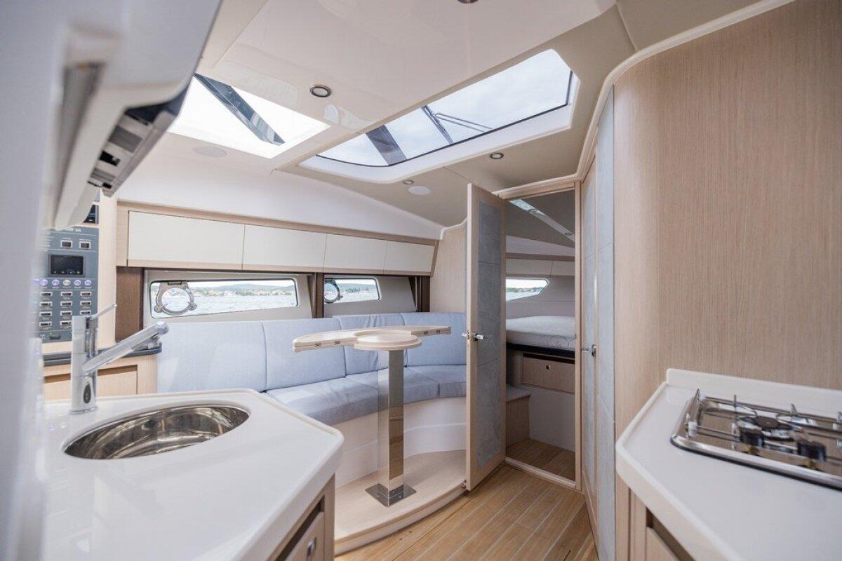 The versatile cockpit is keenly optimised for open-air recreation. In addition to a forward sunbed and secure walkaround side decks, it features a port galley, a six-person dining station, a two-metre sun lounger, an aft 'Beach' and a large canvas sunroof for socialising under the sun.