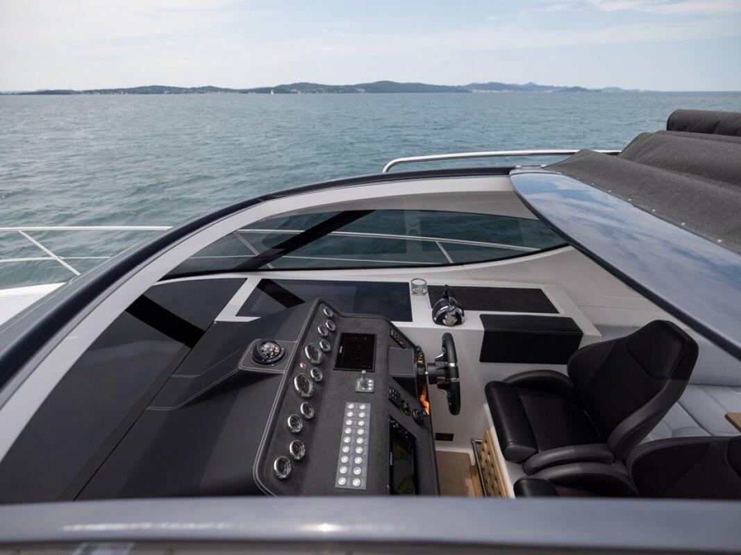 The versatile cockpit is keenly optimised for open-air recreation. In addition to a forward sunbed and secure walkaround side decks, it features a port galley, a six-person dining station, a two-metre sun lounger, an aft 'Beach' and a large canvas sunroof for socialising under the sun.
