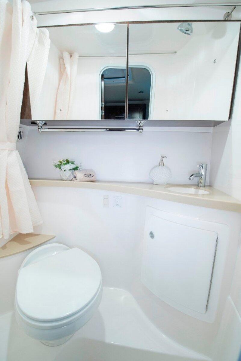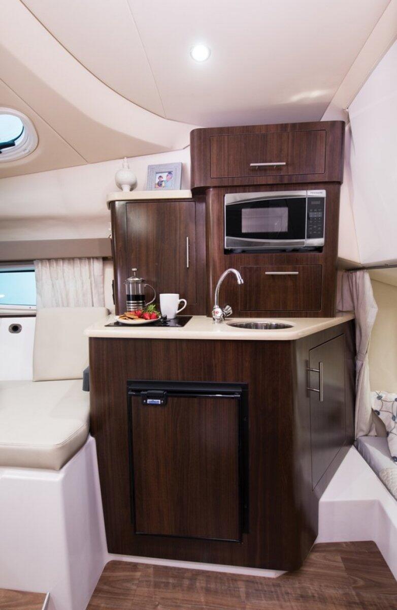 The largest-in-class head features 6-foot head room, black cherry cabinetry, a dedicated shower, and solid surface counter tops.
