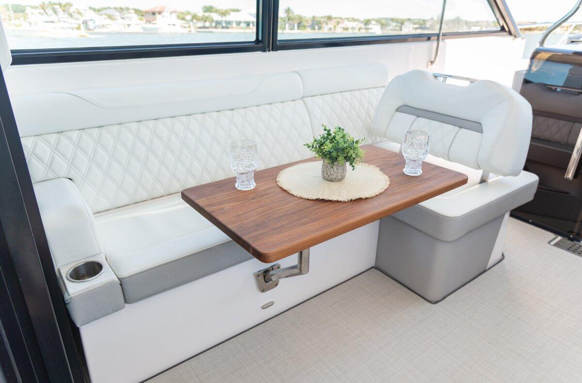 Let in some sunshine and fresh air with a retractable hardtop and windshield walk-through. Close the salon completely by upgrading to optional glass enclosure doors.