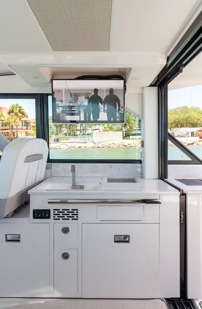 The 36 XO's galley featuring the optional sliding glass enclosure doors effortlessly integrates the salon and aft seating area. With everything you need to cook and entertain all in one place, nothing will get in the way of a good time.