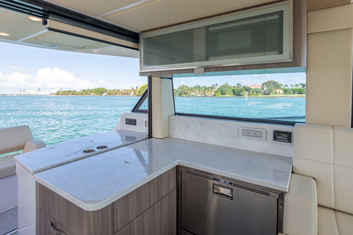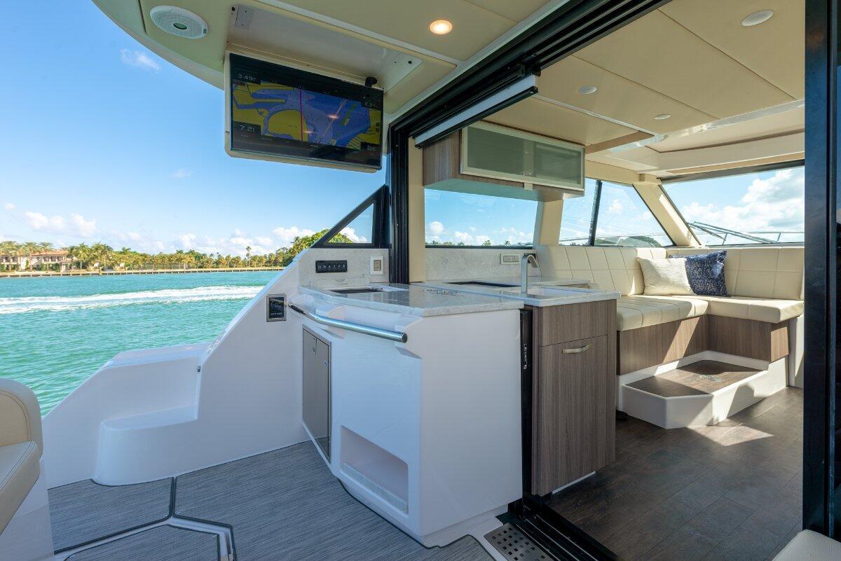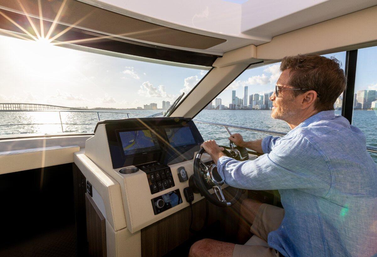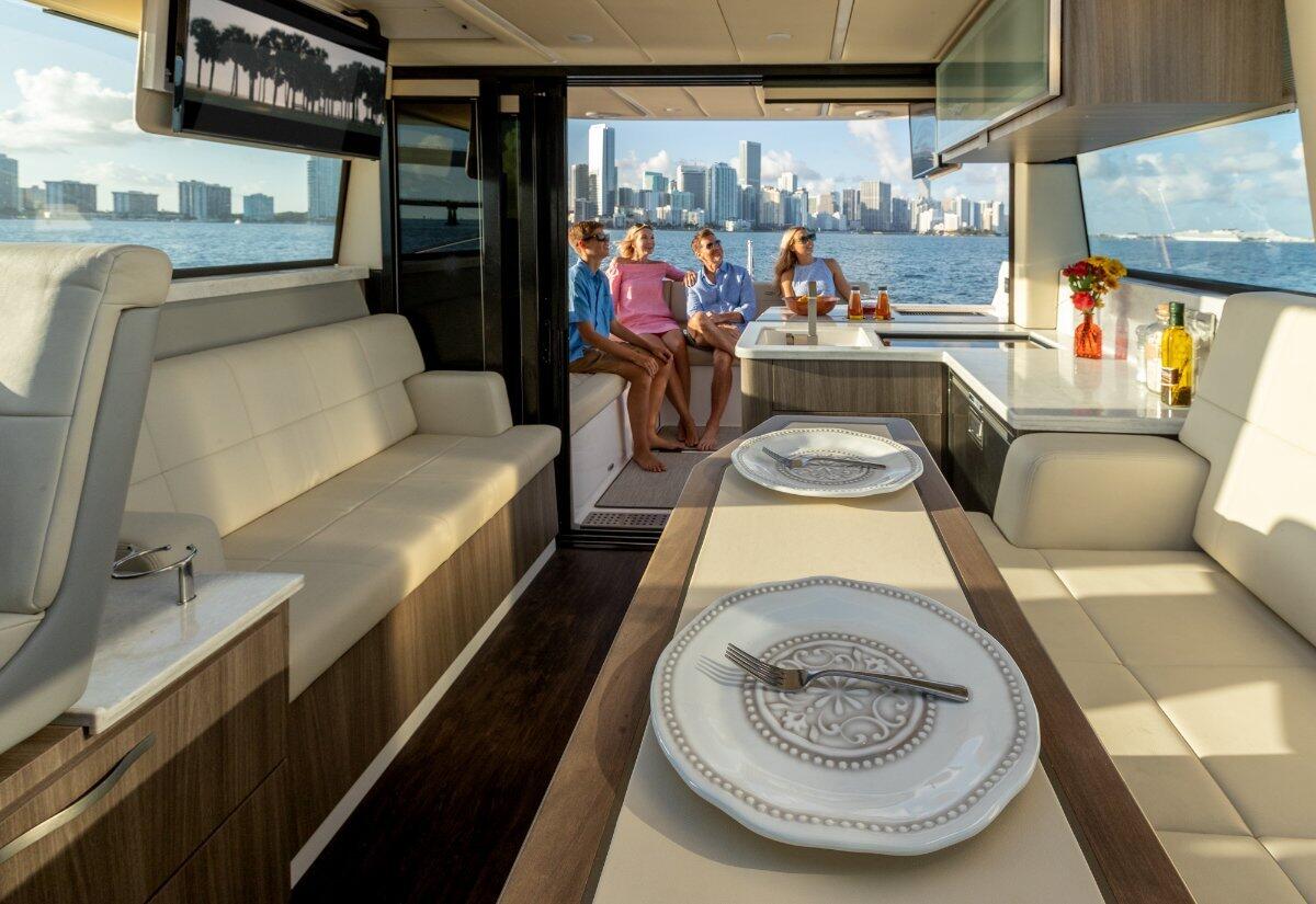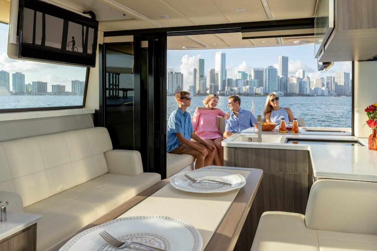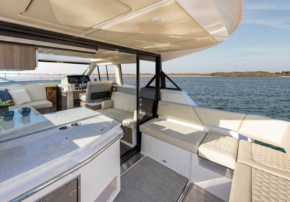 Lower the large window with just the push of a button and slide open the enclosure doors to seamlessly blend the cockpit and salon.