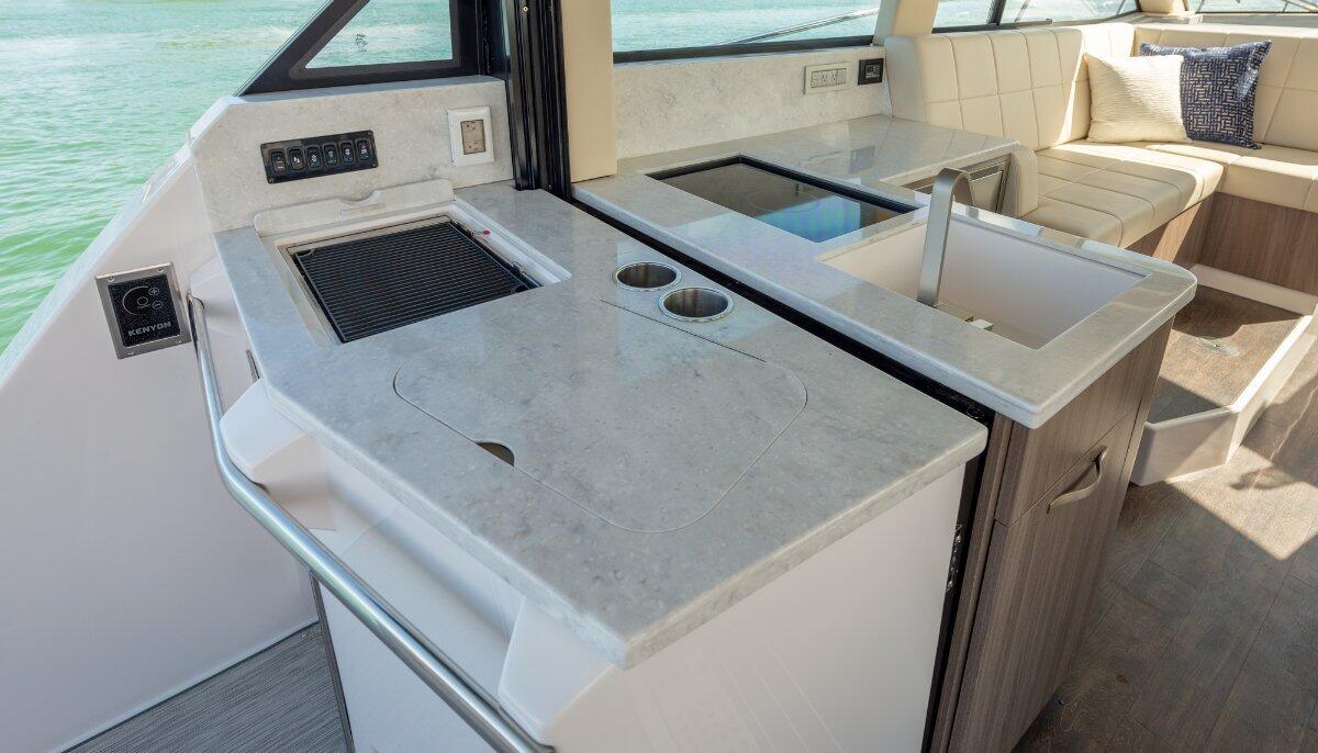The galley combines with the outdoor refreshment center to serve as a versatile meal prep station.