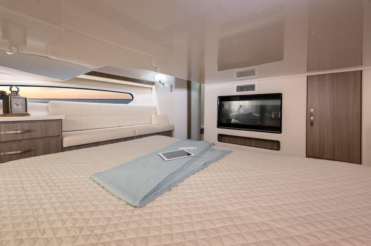 Featuring a California Queen bed, easy access on both sides, and an unheard amount of storage beneath, the forward stateroom not only raises the bar but is in a class of its own.
