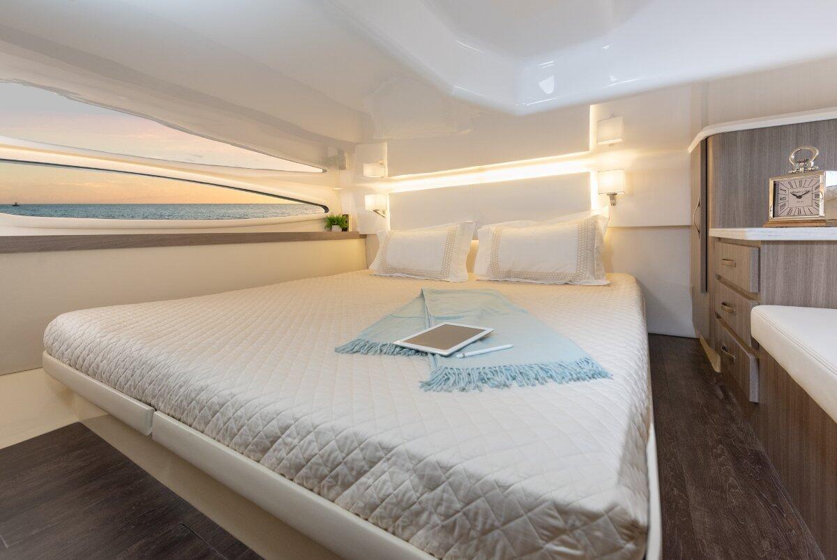 The 38 Grande Coupe's aft stateroom features a hand-crafted settee and an abundance of storage.