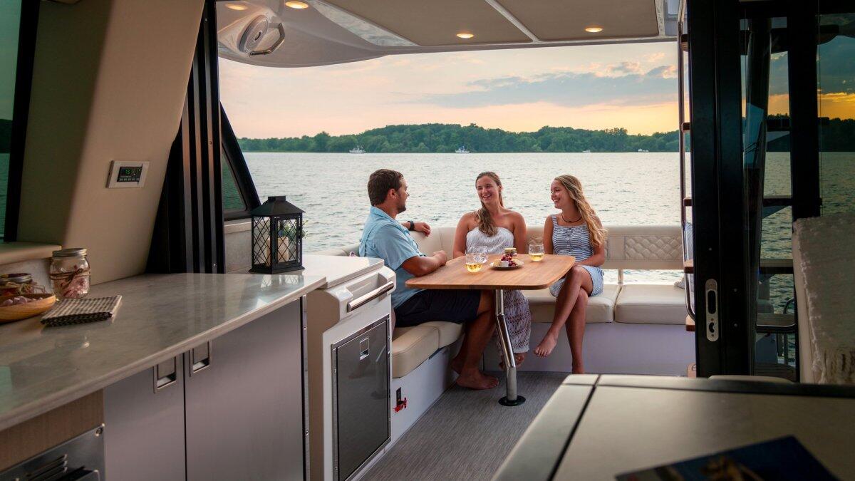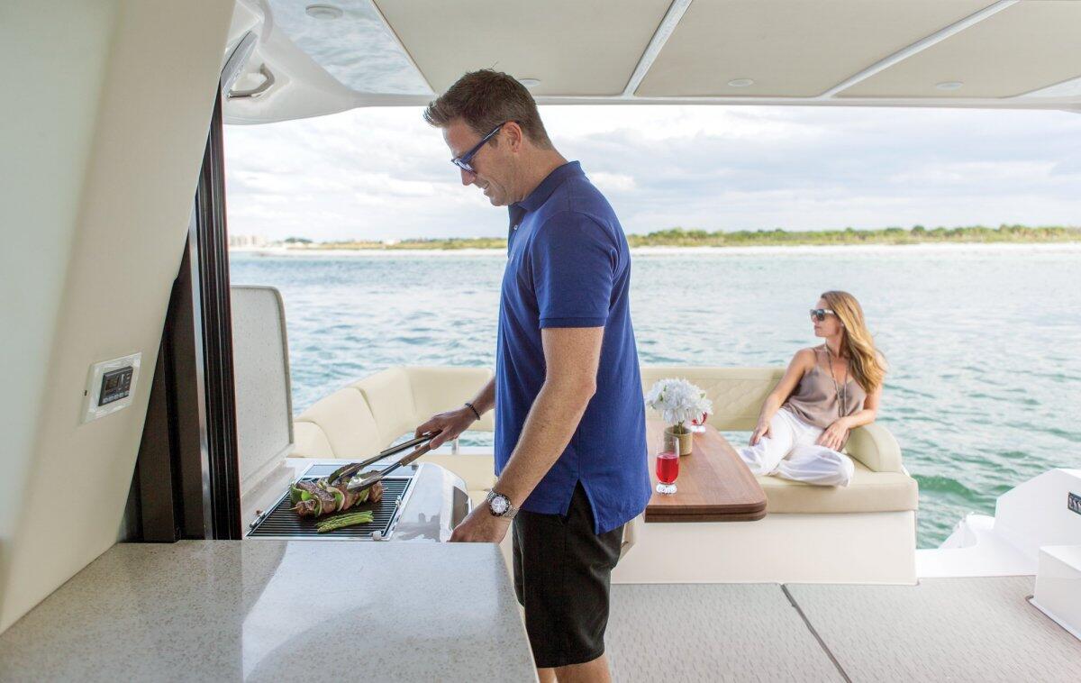 The aft cockpit features an outdoor refreshment center with a smokeless electric grill and refrigerator. For added entertainment capability, slide open the glass enclosure and your outdoor refreshment center combines with your salon galley.