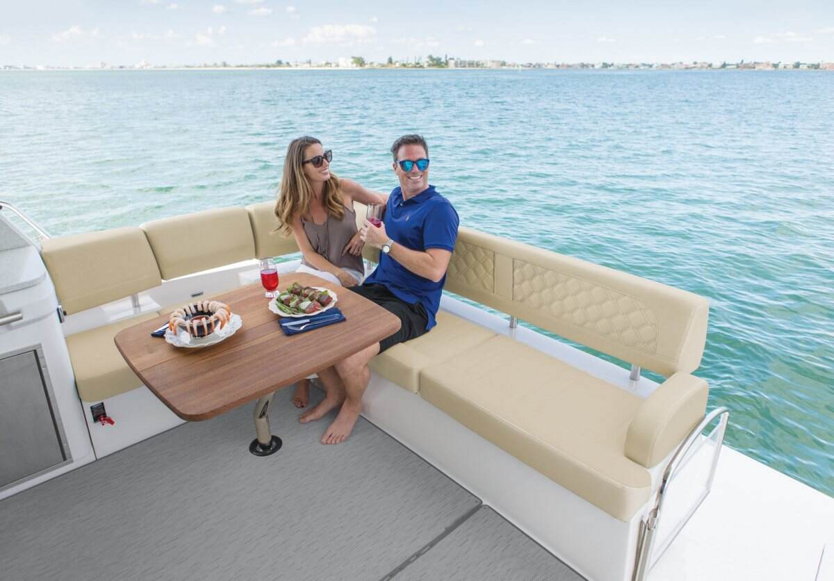 Lay back and enjoy the sunshine or sit up and watch the water on the mulitposition foredeck sunpad. The optional cabana is perfect if you love the view but want some shade.