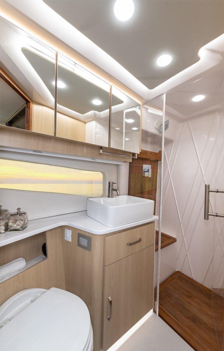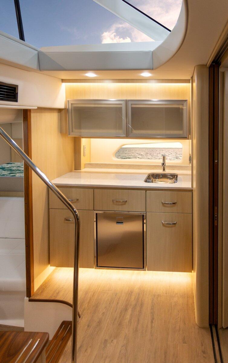 Customise your 42 Fly for your needs. Choose either a refreshment centre or a second head in the cabin.
