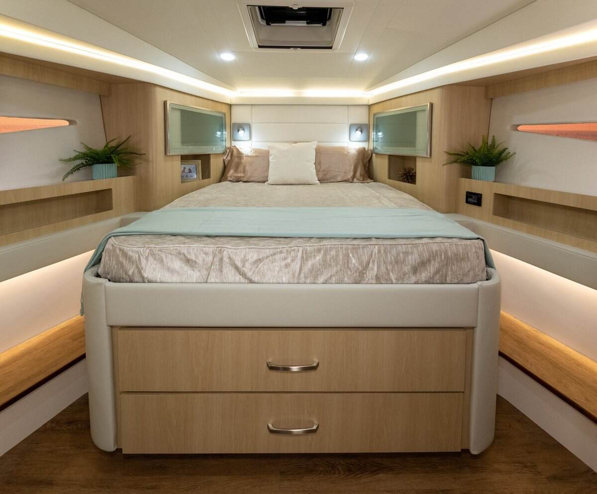 The forward stateroom features a full-sized queen bed that is set at the perfect height and has a wide walk-around room on both sides.