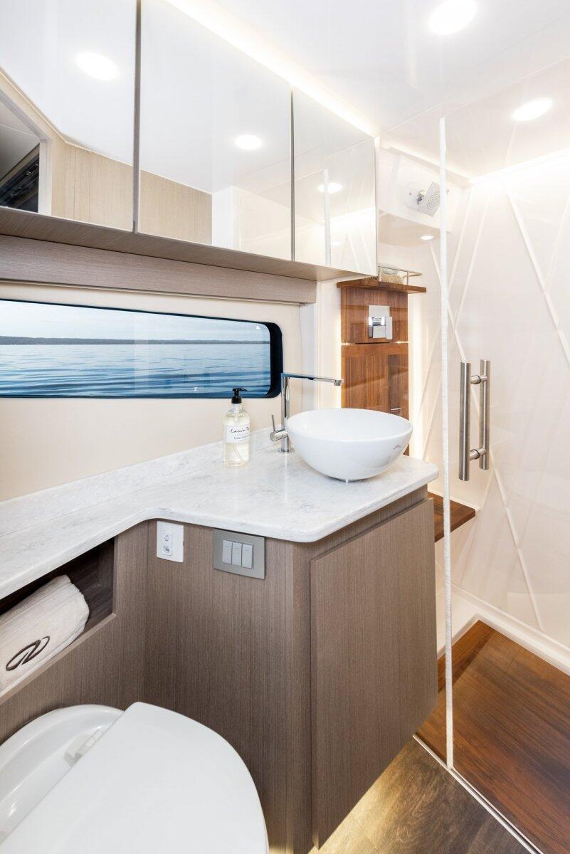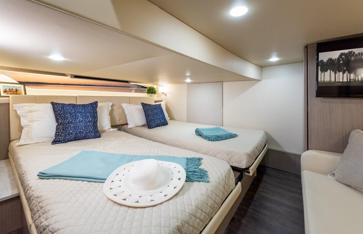 The aft stateroom raises the bar as the largest in its class. A full size king bed with plenty of walk around space can easily be converted into two twin beds.