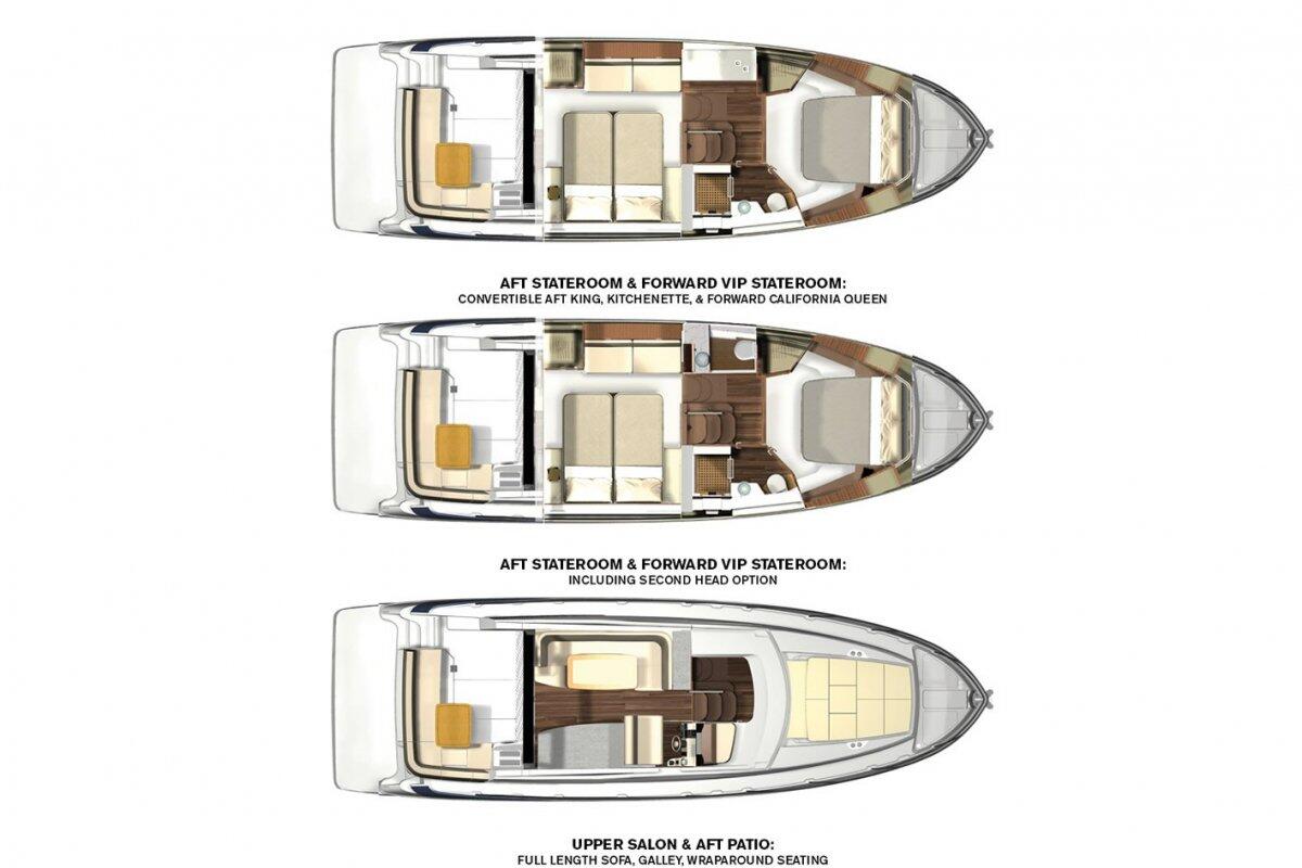 This innovative sprawling layout seamlessly blends the upper salon and aft patio into one immense open space.
