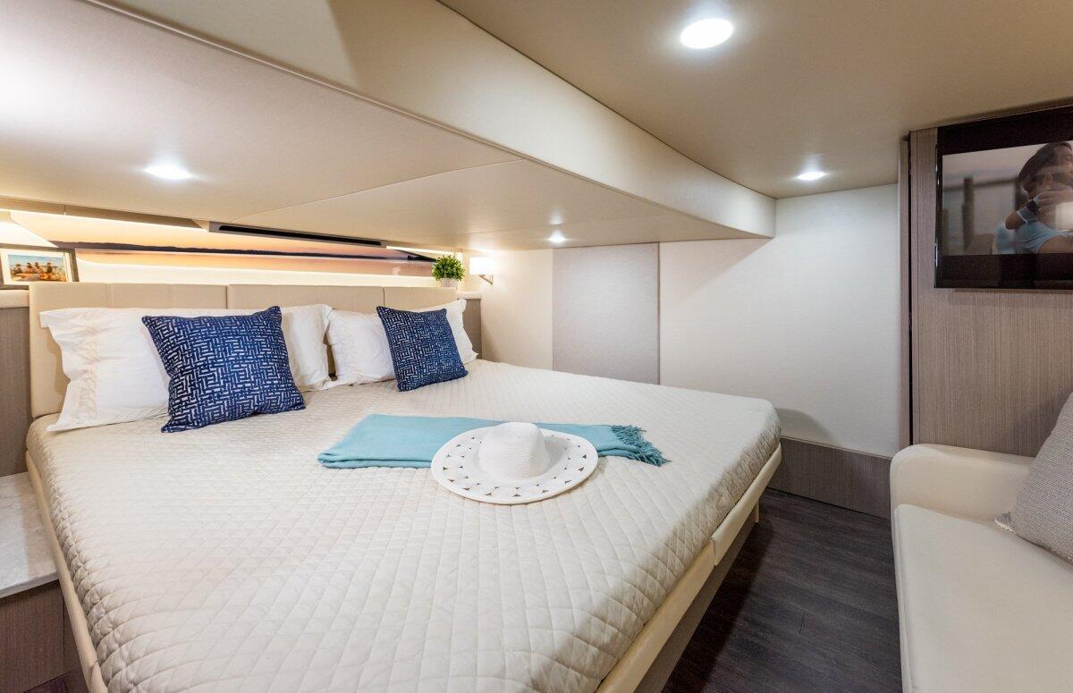The forward stateroom is unrivaled. An island California queen bed is set at the perfect height and has full walk-around space for easy entry.