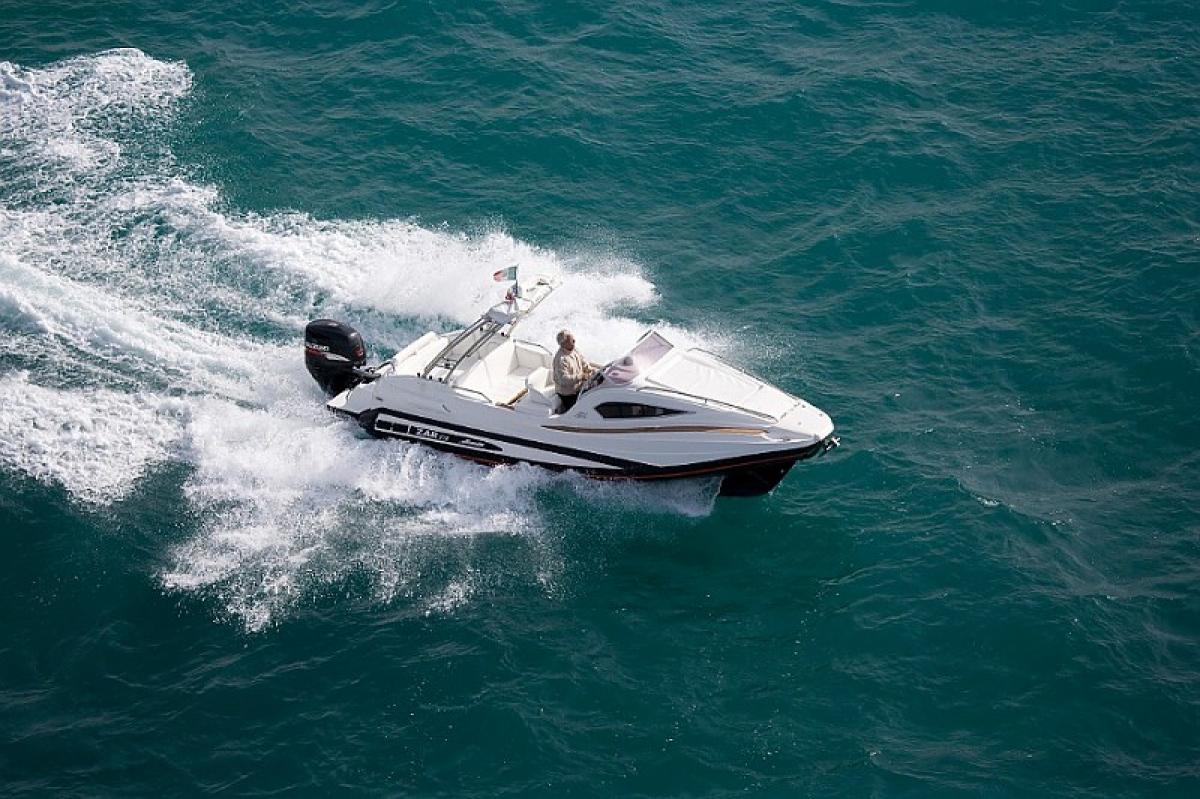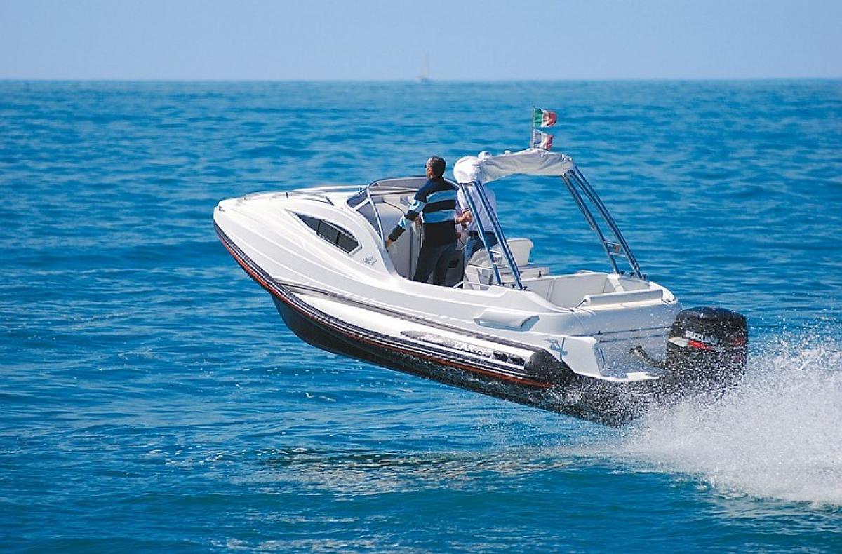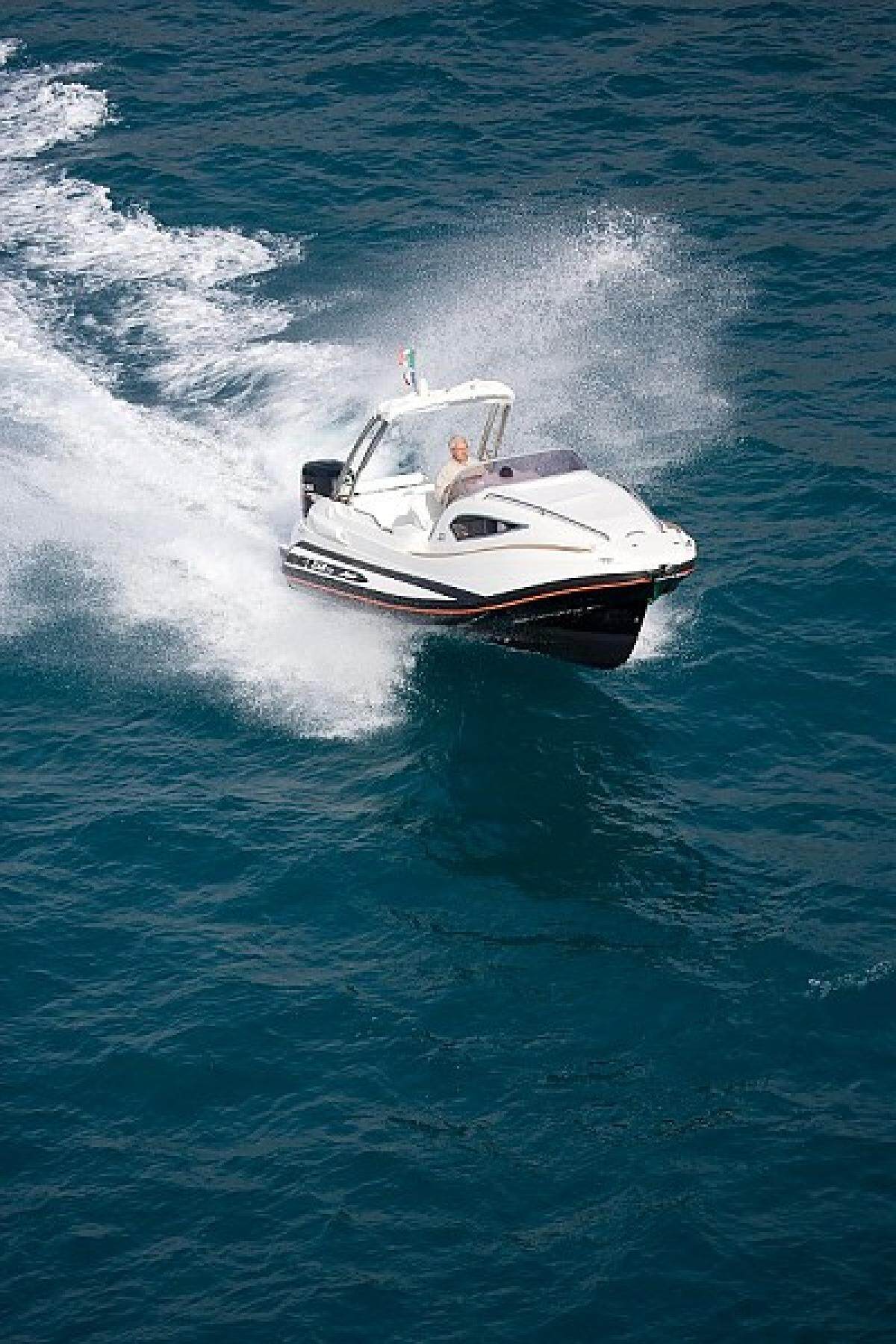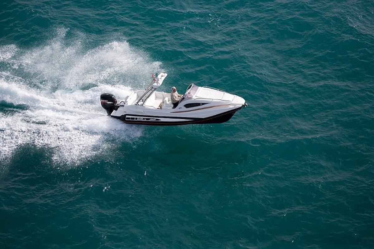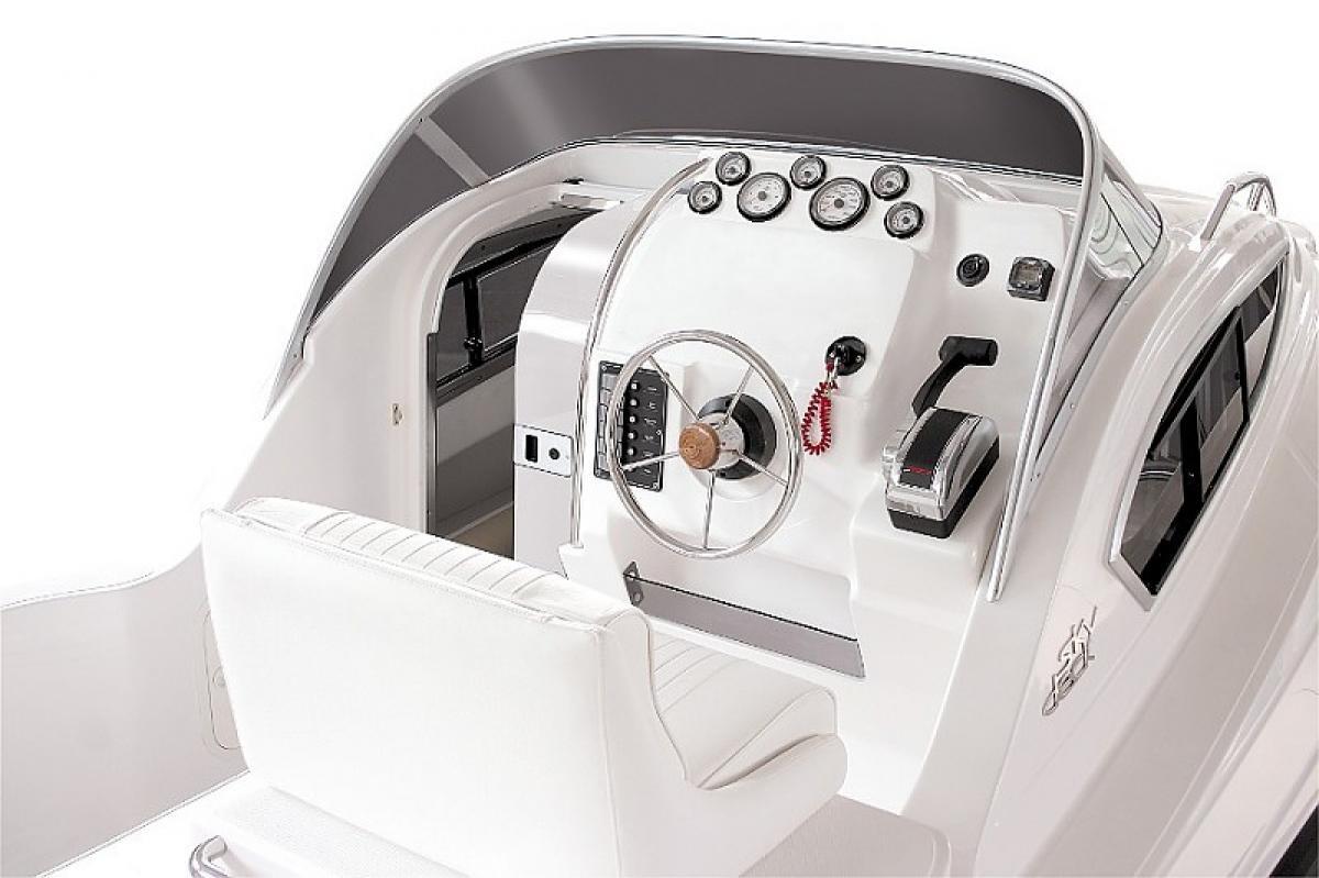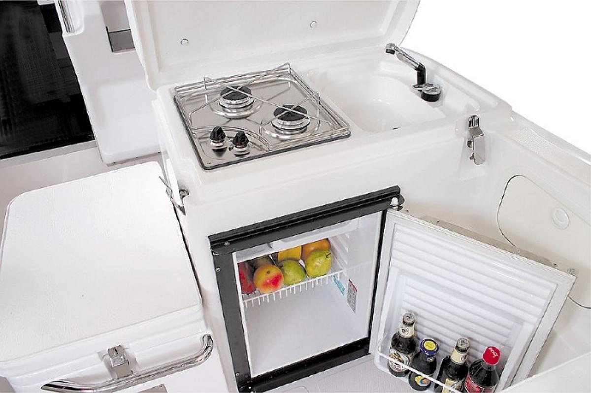 The kitchen comes complete with fridge, sink and a cook top that appears, as if by magic, from underneath the helm seat. There is also another sunbathing area above the cabin deck, a roll-bar with canopy, lockers and small cupboards everywhere and a ladder for boarding the boat after a healthy and invigorating dip in the sea. It also has a rear platform with gangway to reach the jetty easily, LED spot lights, a forward anchor locker and mooring gear, a raised helm seat with a commanding view of the sea and large opening windows.