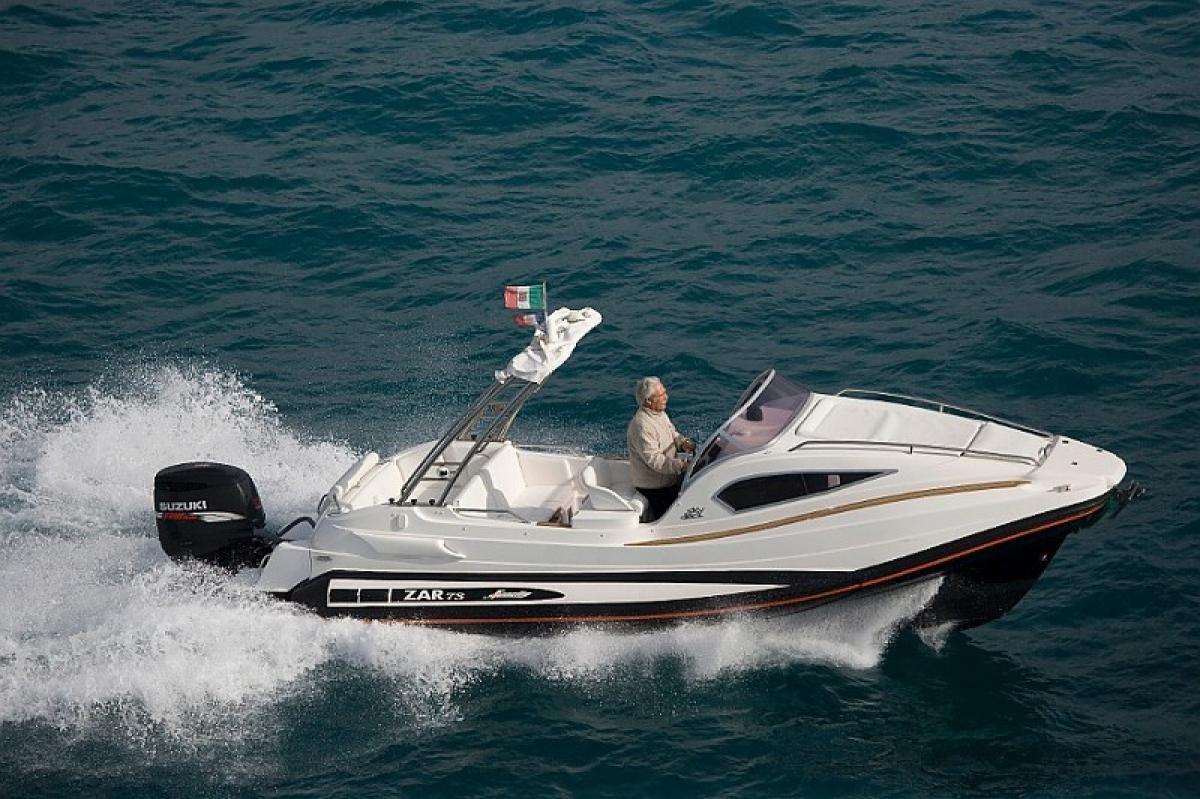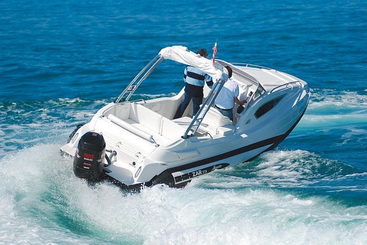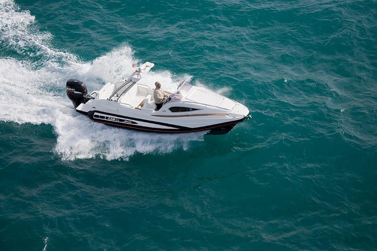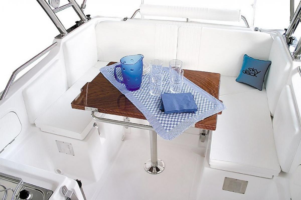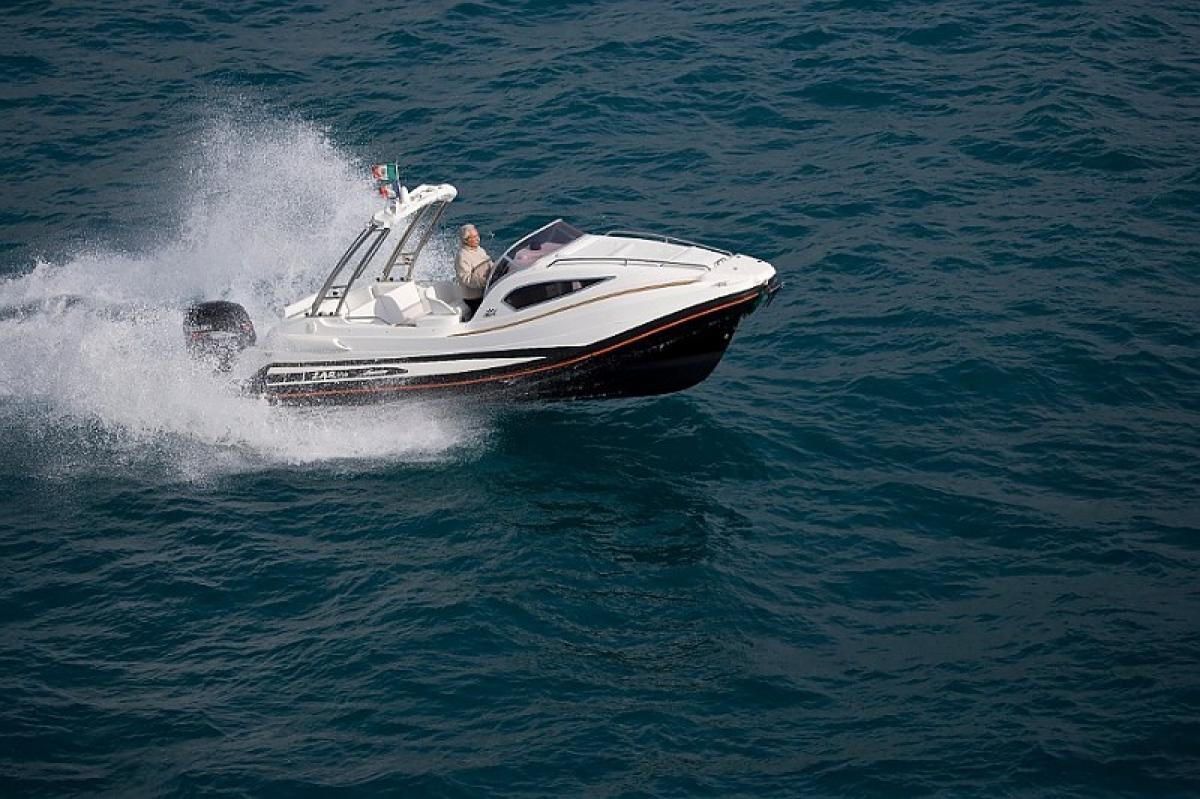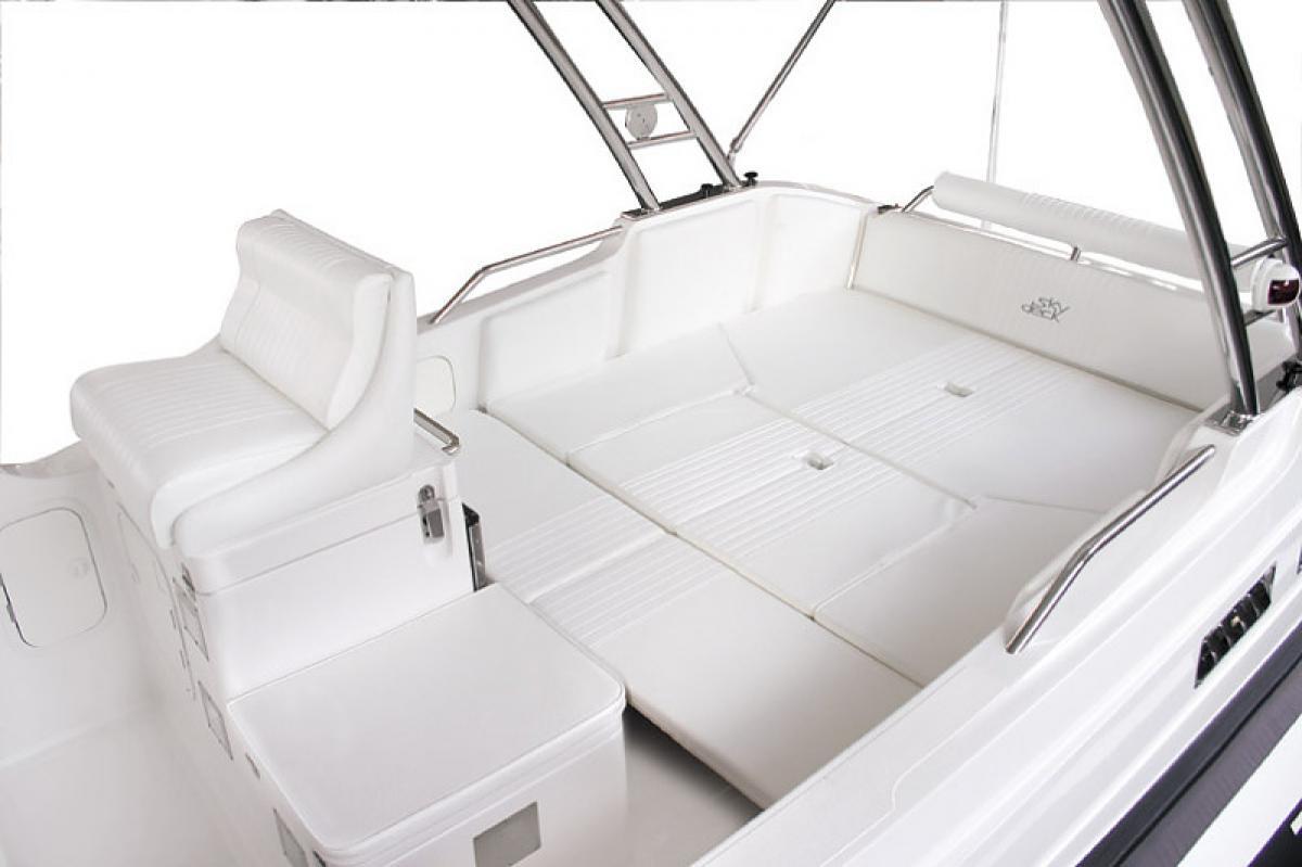 The kitchen comes complete with fridge, sink and a cook top that appears, as if by magic, from underneath the helm seat. There is also another sunbathing area above the cabin deck, a roll-bar with canopy, lockers and small cupboards everywhere and a ladder for boarding the boat after a healthy and invigorating dip in the sea. It also has a rear platform with gangway to reach the jetty easily, LED spot lights, a forward anchor locker and mooring gear, a raised helm seat with a commanding view of the sea and large opening windows.