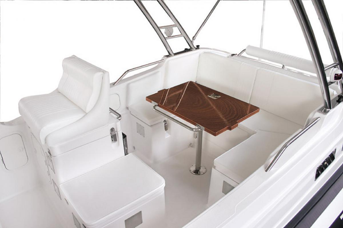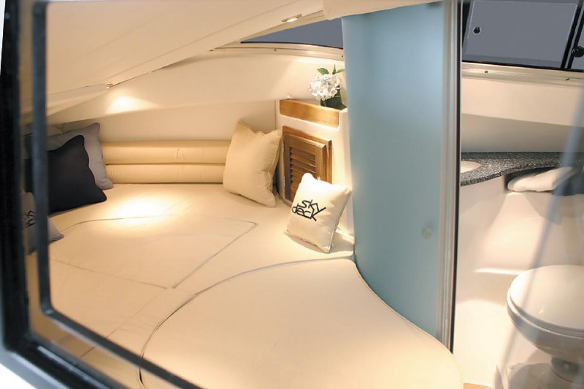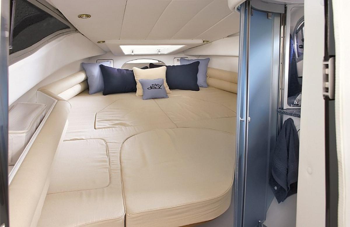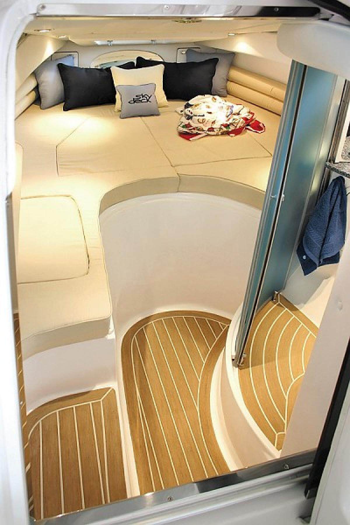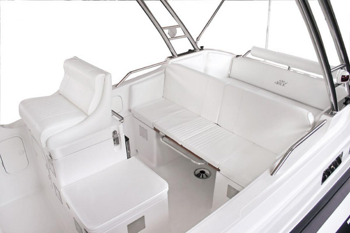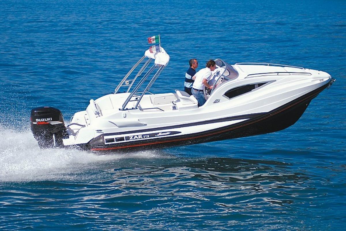 The kitchen comes complete with fridge, sink and a cook top that appears, as if by magic, from underneath the helm seat. There is also another sunbathing area above the cabin deck, a roll-bar with canopy, lockers and small cupboards everywhere and a ladder for boarding the boat after a healthy and invigorating dip in the sea. It also has a rear platform with gangway to reach the jetty easily, LED spot lights, a forward anchor locker and mooring gear, a raised helm seat with a commanding view of the sea and large opening windows.